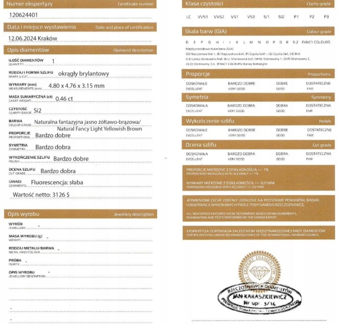 b>сертифікатомоцінювача Польського геммологічного товариства, компанії Diamond Sky, яка працює на польському ринку 30 років (у розділі для налаштування обов'язкових параметрів Allegro, немає сертифіката для вибору при виборі - інше).