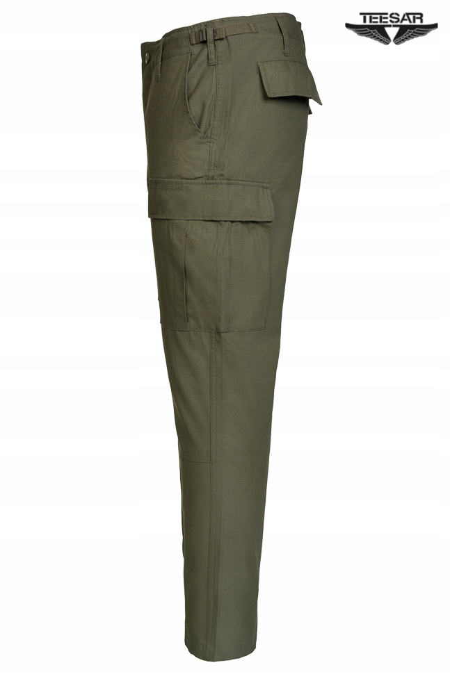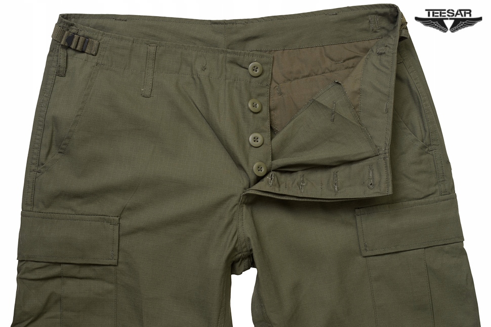 Військові штани BDU (бойова сукня) - класичний візерунок, введений для потреб армії США. Вони здобули визнання в уніформованих послугах по всьому світу, дуже стильно ідеально підходять для повсякденного одягу. Виготовлений американською компанією Teesar, Inc - Curtesville, GA. Вони характеризуються великим універсальним розрізом, довговічністю, комфортом та хорошими показниками. Пришивка з легкого та повітряного матеріалу, армованого 100% бавовняною сіткою. У них є шість кишень, дві класичні, дві задні та дві сторони з підвищеною ємністю (в типі вантажу). І задні, і бічні кишені закриті кнопками. Сильний матеріал та додаткове зшивання в чутливих місцях гарантують довговічність використання. Підсилений на колінах і сидіння з другим шаром матеріалу. Двосторонні стрічки для швидкого регулювання окружності в талії дозволяють відповідати штанам з різними силуетами. Внизу регульований Welt був пришиті, щоб носити ноги на взутті або всередині.