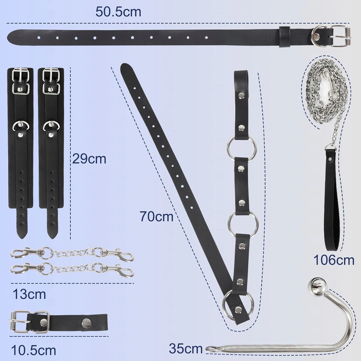 - Усі аксесуари набору BDSM можуть використовуватися разом або окремо, різних ігор для всіх людей. У вас також є ланцюг 1 х для собачого коміра, 1 х неволі, виготовлений з штучної шкіри та 1 х гачка, відповідає різним вимогам користувача