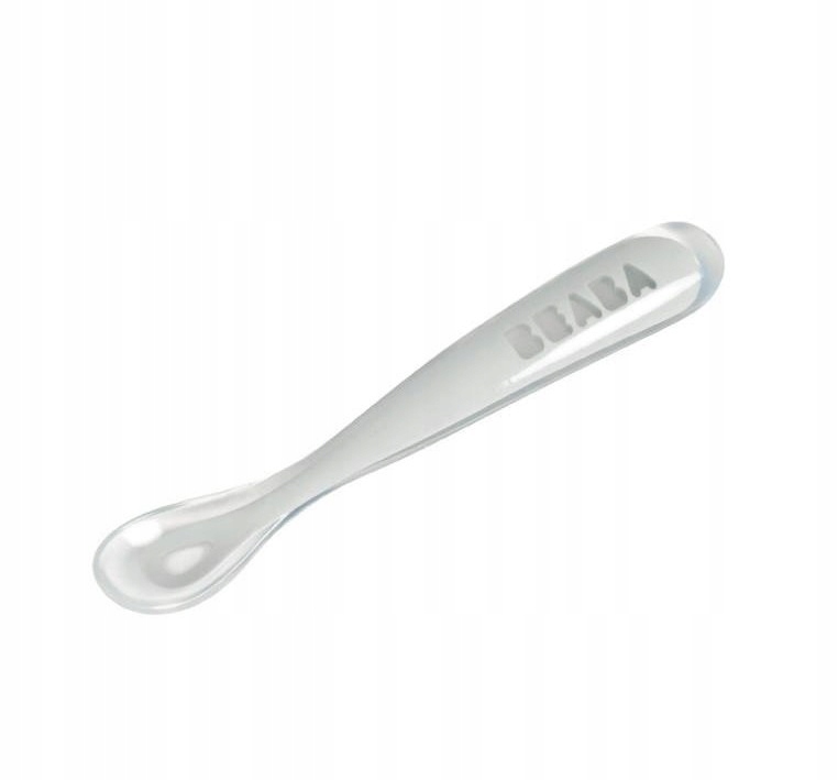 ергономічна перша чайна ложка дитини французької бренду Beaba. Чайна ложка світло -сірого кольору з прозорими краями. М’який наконечник виготовлений з над -еластичного силікону, повністю безпечного для делікатних ясен дитини. Його форма була розроблена, щоб полегшити дитині переходити з сосу на ложку.