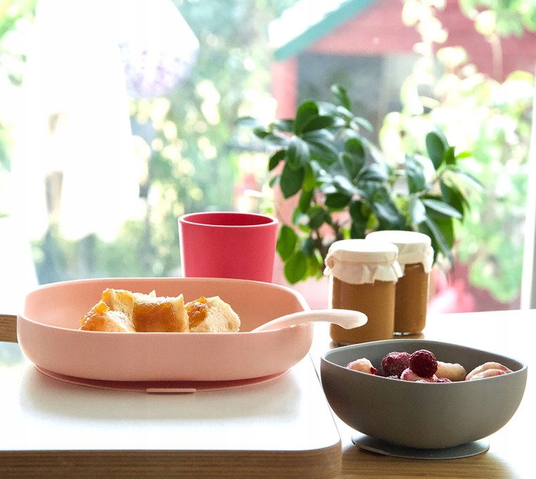 Набір силіконового посуду від французького бренду BEABA складається з тарілки, миски, кухля та навчальної ложки. Всі елементи набору характеризуються ергономічною округлою формою і м'якими плавними краями. Високі борти миски та тарілки полегшують дитині самостійно набирати їжу на виделку чи ложку. Цей посуд має протиковзку присоску на дні, що робить його стійким і добре тримає стіл. Чашка зручна і зручна для навчання пити, а ложка ідеально лягає в рот дитини і її можна опустити так, щоб голова не торкалася поверхні, що робить її використання набагато гігієнічнішим.