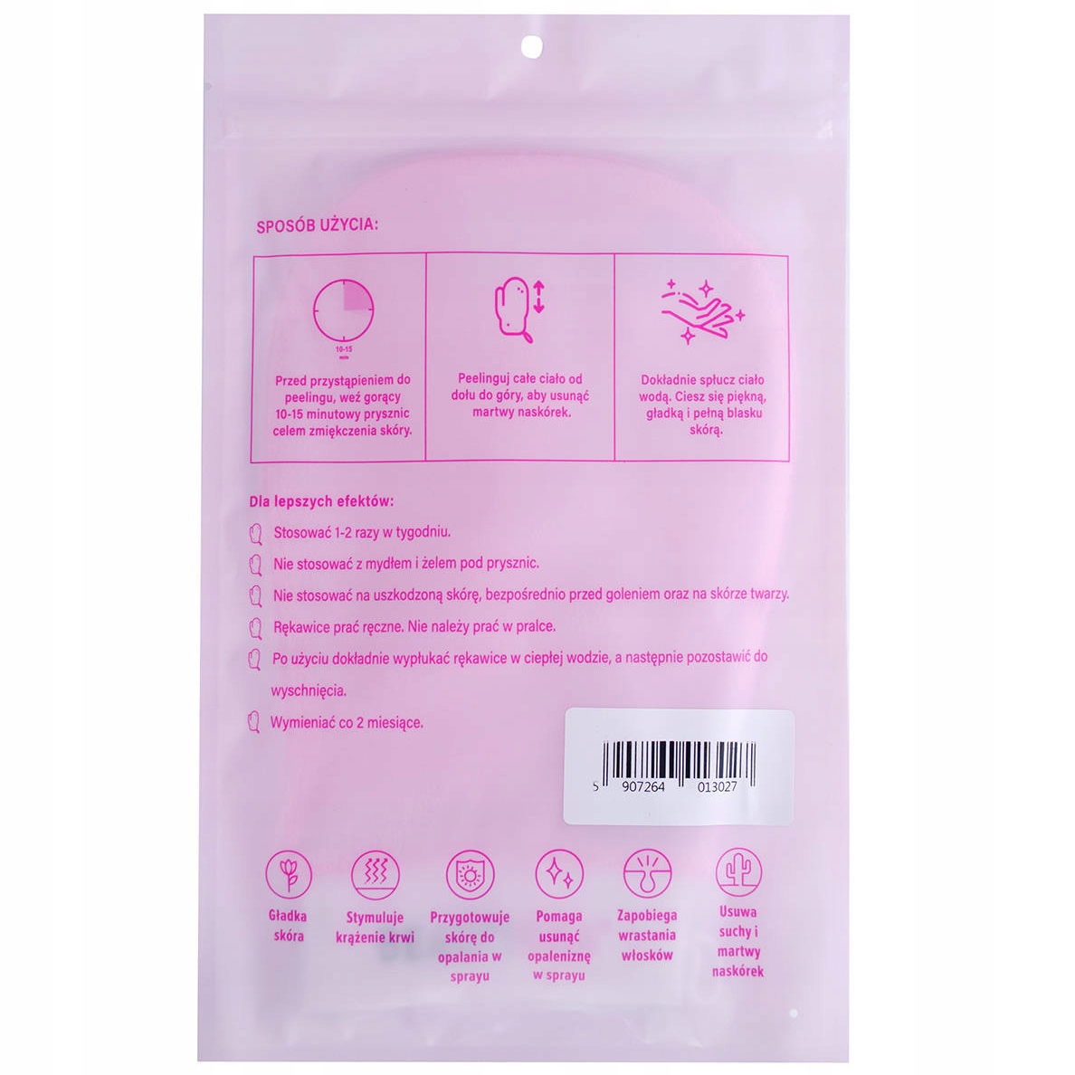 Рукавичка виготовлена з 100% віскози, тому не викликає алергії. Рукавичка виготовлена з віскози і має грубу структуру, тому швидко відлущує шкіру. Для кращих результатів використовуйте рукавички 1-2 рази на тиждень. Рукавичку для пілінгу можна використовувати для всього тіла. Особливо пам’ятайте про такі місця, як стегна, сідниці, руки та ноги.