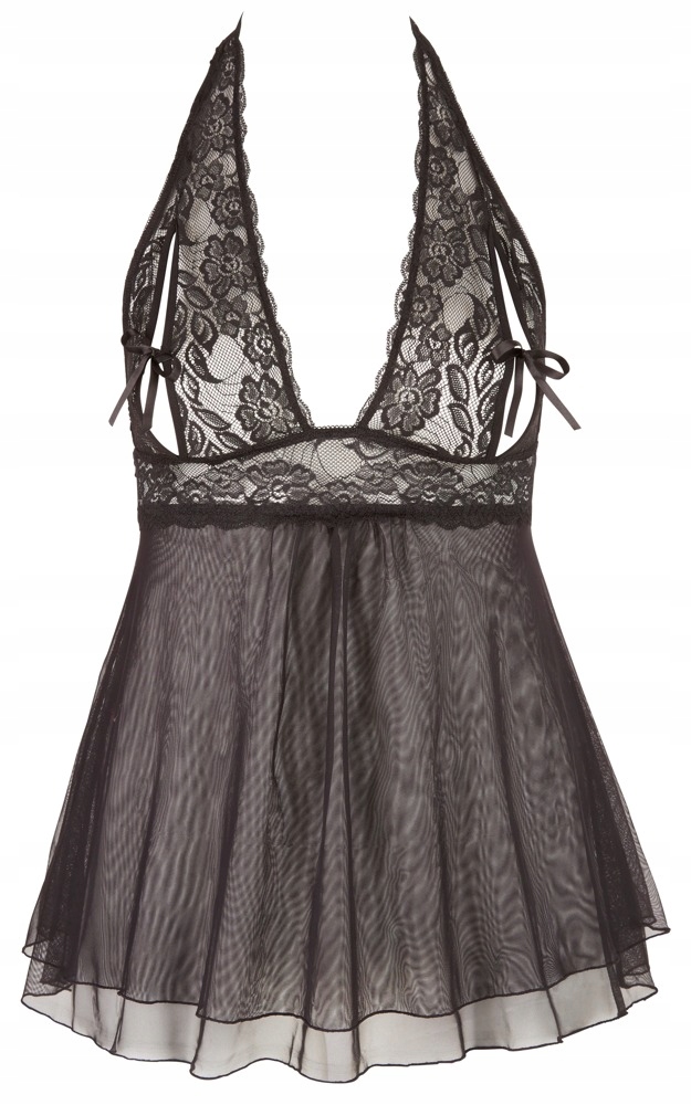 Ніжне мереживо з захоплюючим прозорим виглядом! Цей чорний бебі-долл із застібкою-гачком і вушками ззаду має прорізні чашечки, які привабливо демонструють груди та закриваються невеликим бантом, а двошарова спідниця з хитною формою вміло обігрує стегна.