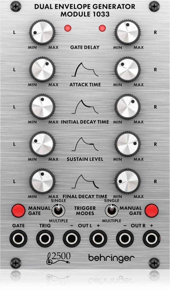 МОДУЛЬ 1033 ГЕНЕРАТОРА З ПОДВІЙНОЮ ГОЛОВКОЮ серії Behringer 2500 є автентичним відтворенням оригінальної схеми «системи 2500» 1970-х років, яка вміщується в стандартний корпус євростійки. Модуль 1033 дозволяє створювати глибоко оброблений сигнал за допомогою 10 регуляторів для незалежного керування затримкою гейту, часом атаки, початковим затуханням, сустейном і кінцевим затуханням. Створюйте верескливі та перкусійні звуки або візерунки, що довго розвиваються, ідеально підходять для фанк-гурву чи похмурого саундтреку до останнього стилю кіберпанк.