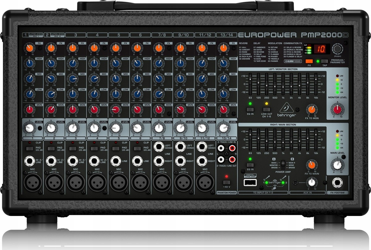 BehringerPMP2000D EUROPOWER– 14-канальний мікшер з підсилювачем 2000 Вт, процесором ефектів Klark Teknik і опцією бездротового зв’язку.