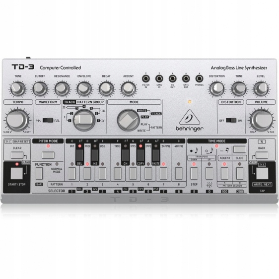 Behringer TD-3-SR аналоговий басовий синтезатор з VCO, VCF, 16-кроковим секвенсором, ефектами спотворення та 16-голосним поліланцюгом, колір: сріблястий Основні риси:
