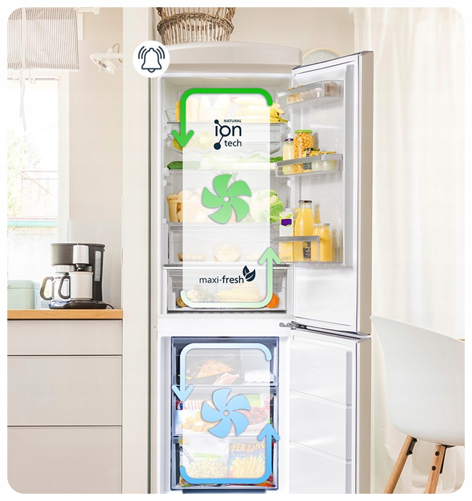 Незалежна система циркуляції повітря в холодильнику та морозильних камерах. Тепле повітря негайно видаляється зсередини, а взамін, надувний прохолодний, регулярно висихаючи внутрішню частину пристрою. 4 Між холодильниками та камерами морозильних камер
