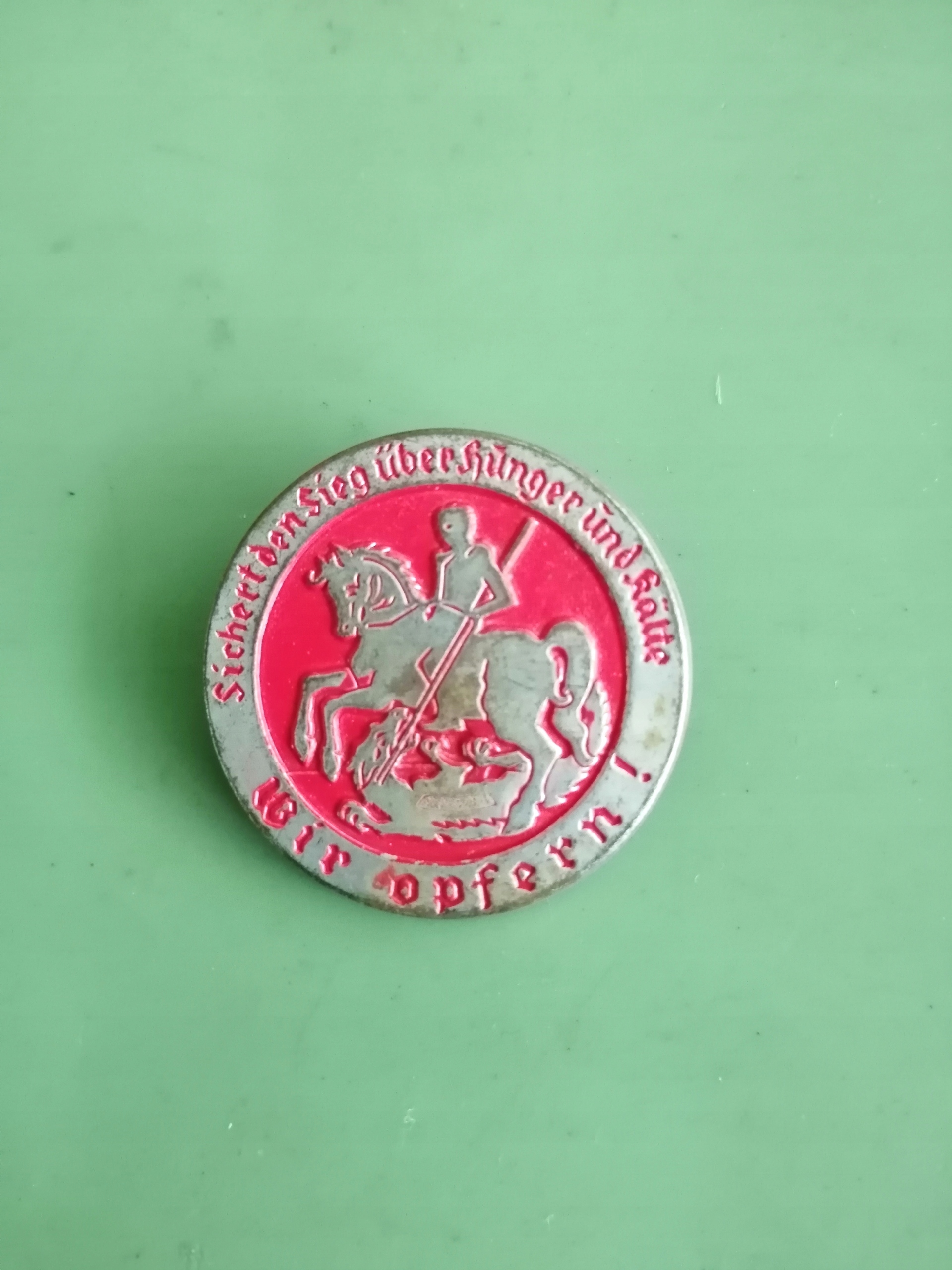 Я рекомендую значок WHW (Зимова допомога) 1933/34. Дата збору березень 1934 р. Напис "SICHERT DEN SIEG UBER HUNGER UND KALTE - WIR OPFERN!" ("ЗА ПЕРЕМОГУ НАД ГОЛОДОМ І ХОЛОДОМ - ПРОПОНУЄМО").