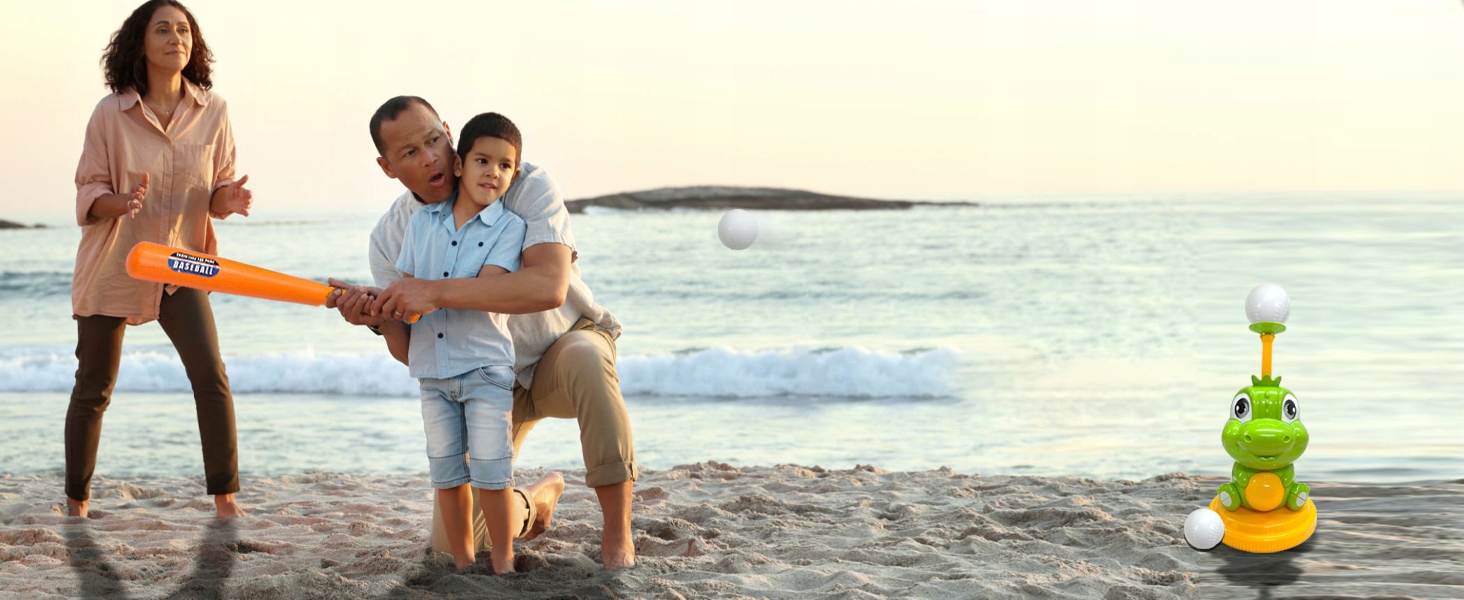 Пограйте з дітьми в бейсбол, просто вставте бейсбольний м’яч у пристрій для запуску м’яча-динозавра, натисніть кнопку запуску та подивіться, як м’яч вилітає в повітря. Потім діти можуть використовувати бейсбольну біту, щоб вдарити по м’ячу якомога далі, практикуючи координацію рук і очей і розважаючись.