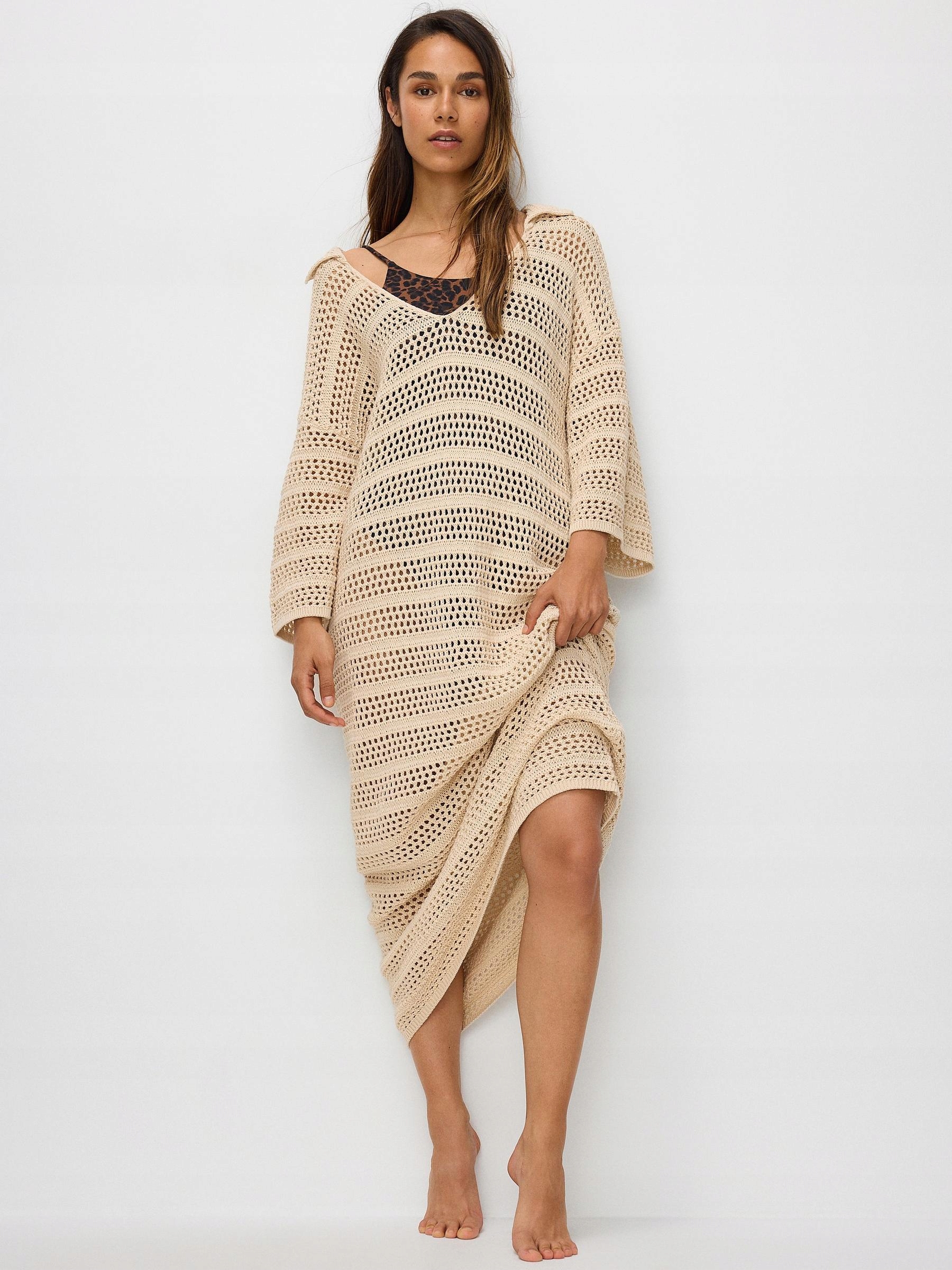 БЕЖЕВА Ажурна ВІЛЬНА ПЛЯЖНА СУКНЯ МАКСІ, РУКАВ 3/4, КОМІР M