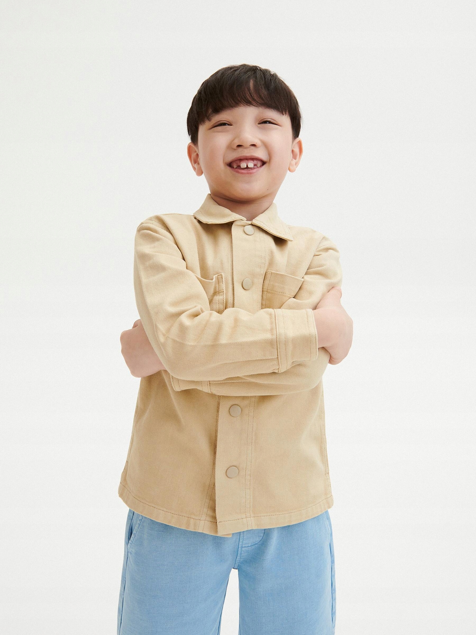 БЕЖЕВА БАВОВНОВА ДЖИНСОВА СОРОЧКА З ДОВГИМ РУКАВОМ І КОМІРОМ 152
