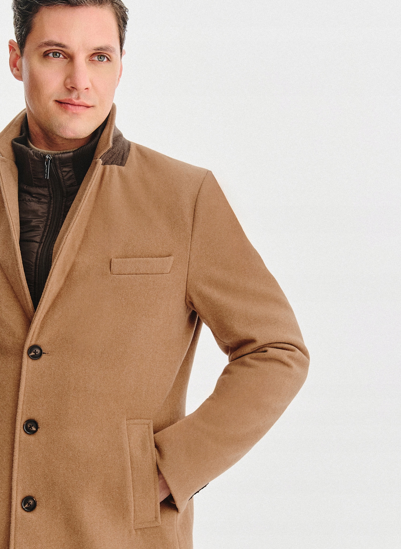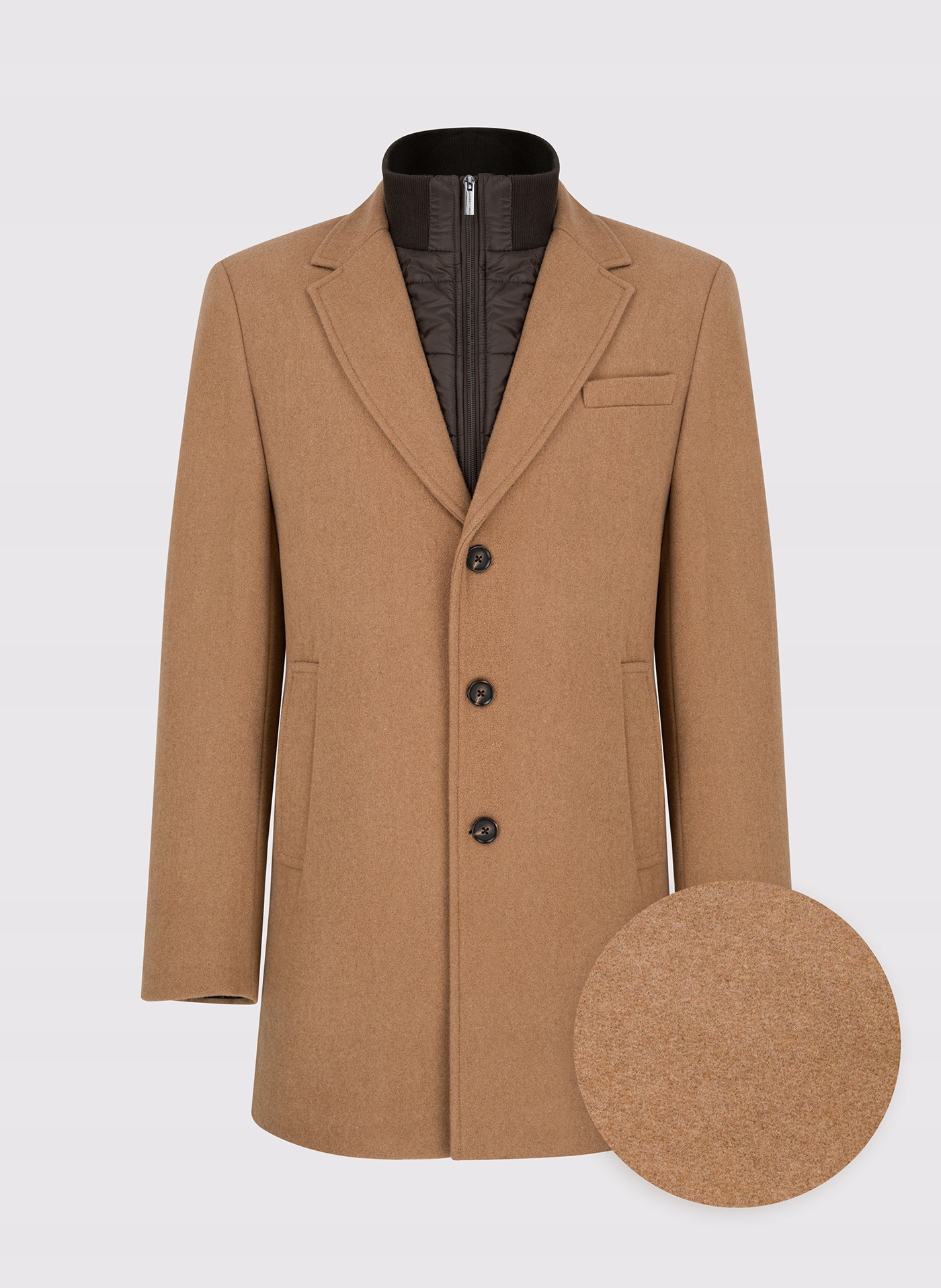 Бежеве чоловіче пальто з колекції Pako Lorente. Модель простого крою точно сподобається чоловікам, які цінують елегантність, комфорт і, насамперед, функціональність. Знімний комір всередині пальто робить пальто дуже практичним і ви можете легко змінити його зовнішній вигляд. Високий комір - це елемент, який можна від'єднати від усього пальто за допомогою блискавки. Пальто з однобортною застібкою на три темних гудзики. Пальто має дві похилі кишені спереду, в які легко помістяться дрібниці. Ззаду на пальто є розріз, який забезпечує свободу рухів. Бежеве, класичне пальто – must-have осінньо-зимового сезону. Такий універсальний крій підійде під будь-який стиль, як повсякденний, так і більш офіційний.