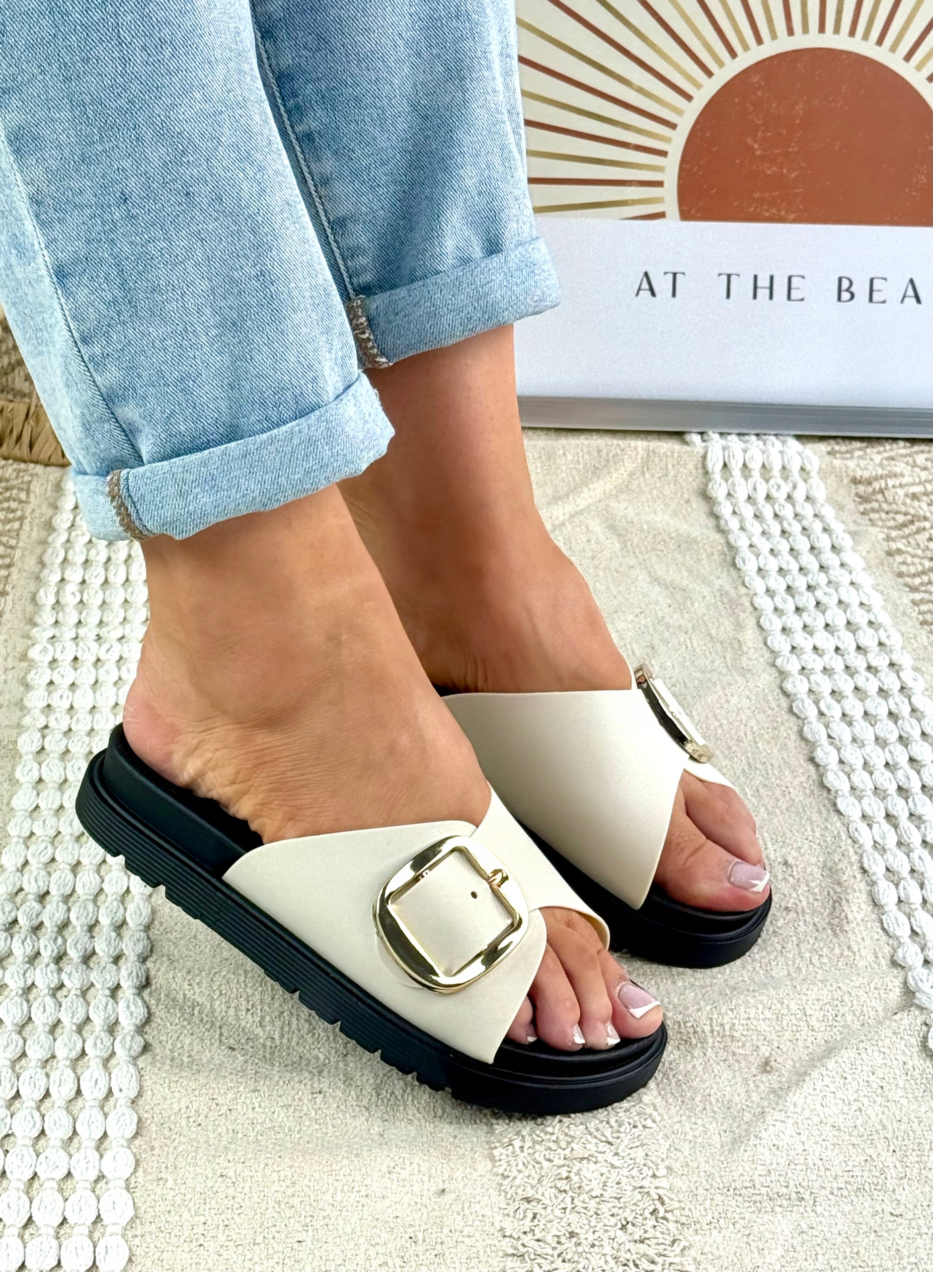 Жіночі бежеві шльопанці з плоскою м'якою зручною підошвою. Ідеально як повсякденне взуття. Вони також легко адаптуються до елегантних стилізацій. Профілерована вставка забезпечує комфорт використання. Пришита підошва призводить до більш тривалої міцності взуття.