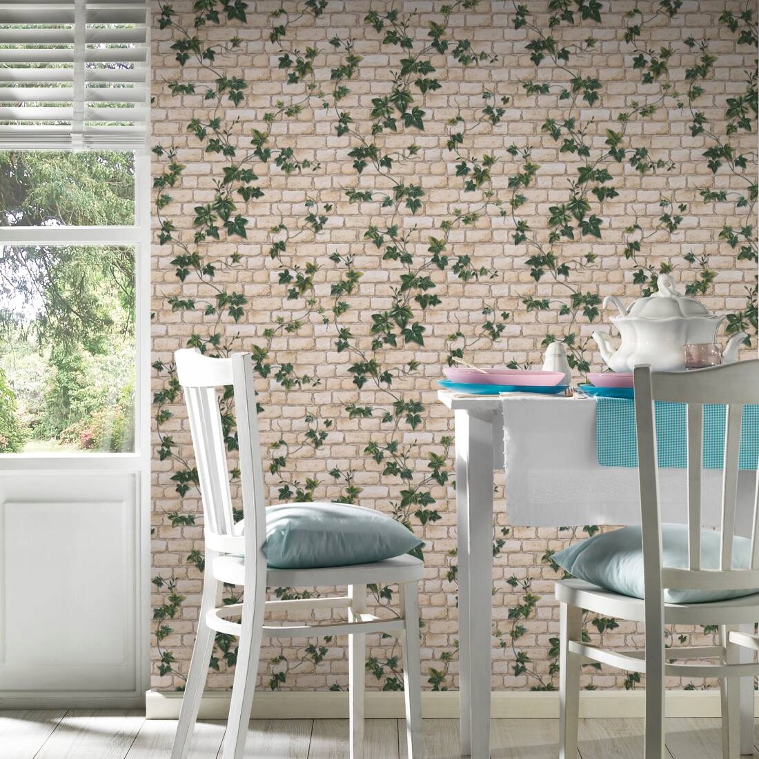 Сучасні шпалери з бежевим цегляним візерунком із зеленим листям плюща з гладкою фоновою структурою. Шпалери створюють тривимірний ефект на стіні.