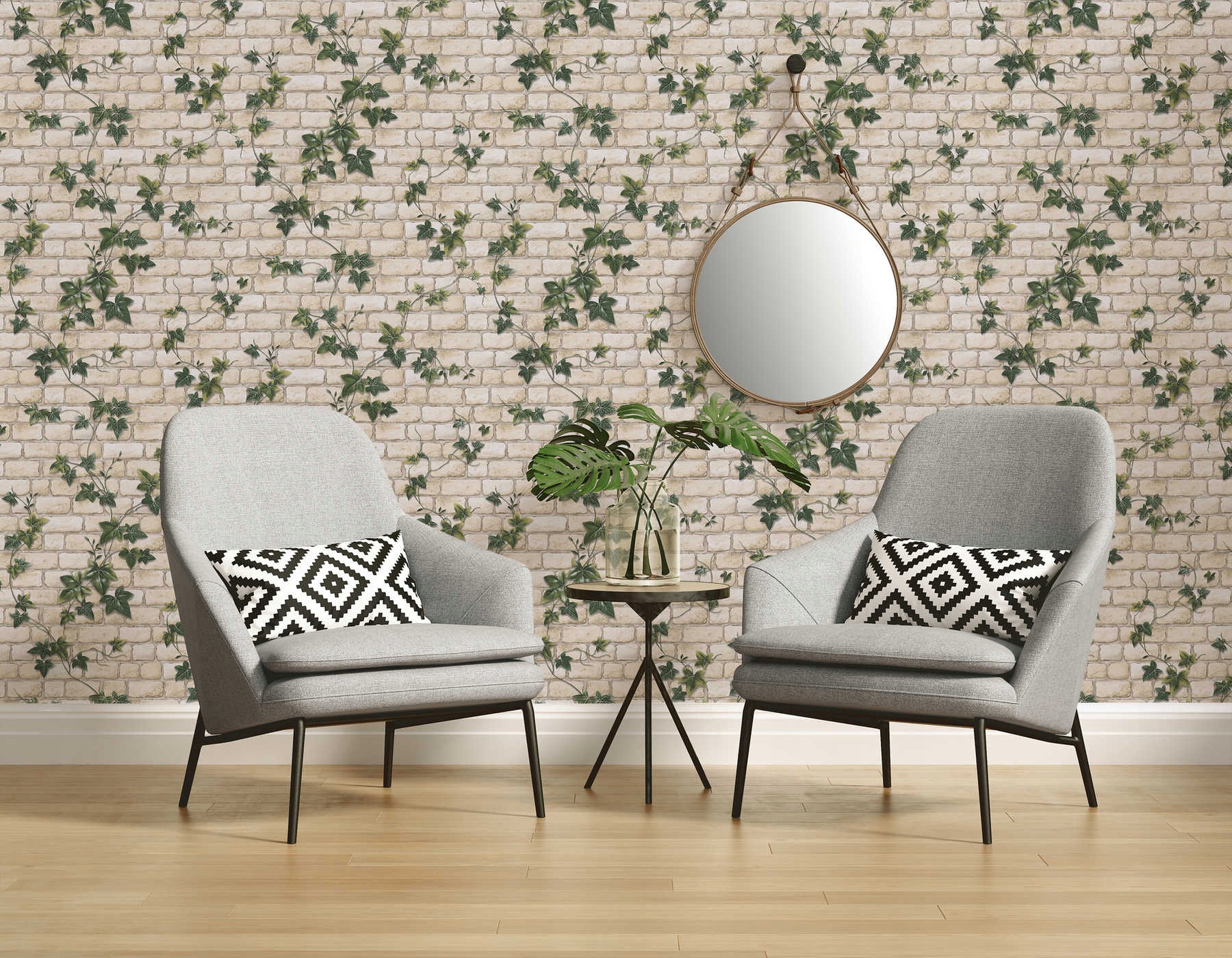 БЕЖЕВІ Шпалери з цегли з зеленим плющом