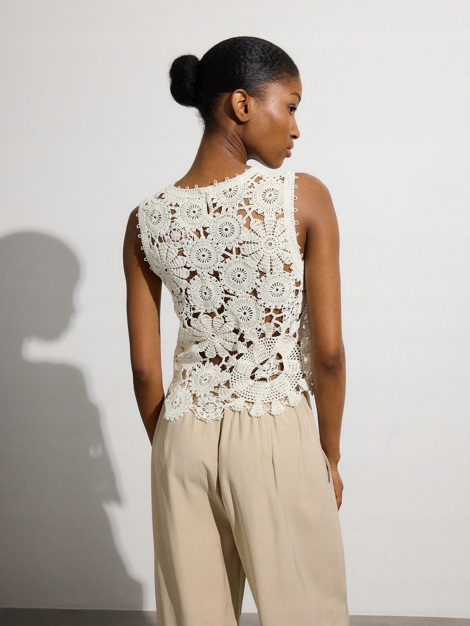 БЕЖЕВИЙ ТОП З АЖУРНИМ ПЛЕТИННЯМ, КРУГЛИЙ ГОРИЙ, ТОВСТІ БРЕТЕЛЬКИ