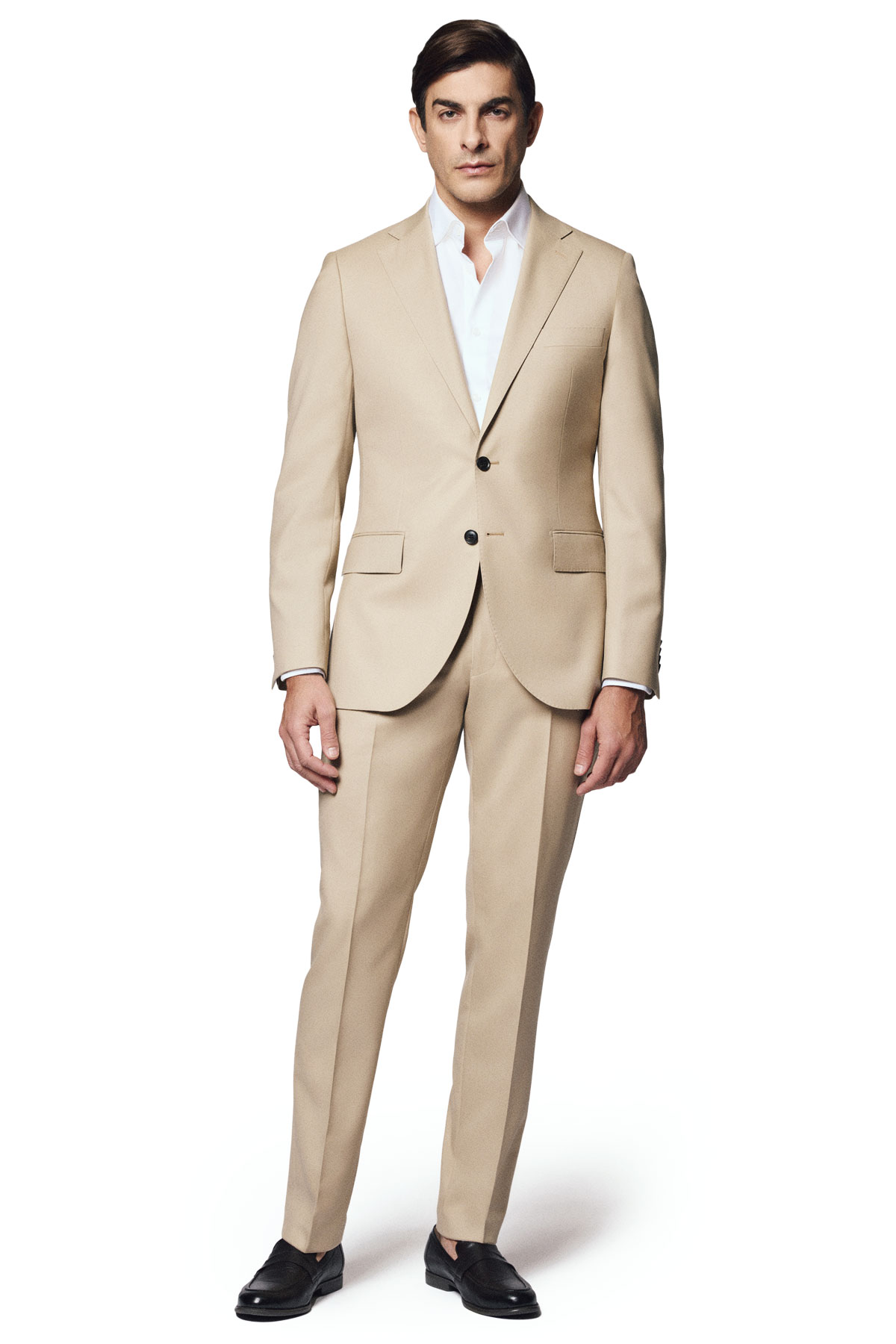 Уявіть собі літню ауру - ніжні промені сонця, ласкавий вітер і ваш зручний, легкий, повітряний світло-бежевий костюм. Це модель Percoto з нашої останньої весняно-літньої колекції. Костюм виготовлений з дихаючої 100% вовняної тканини відкритого переплетення, що забезпечує циркуляцію повітря та приємне відчуття прохолоди. Наші фахівці ретельно відібрали цю тканину із сотень зразків кращих ткацьких фабрик. Костюм складається з однобортного піджака на двох ґудзиках і брюк без складок, злегка завужених донизу. Найважливішою особливістю цих штанів є еластичний пояс, який дозволяє змінювати окружність на три розміри. Піджак має прямі лацкани, дві кишені з клапанами, нагрудну кишеню та міцні вишукані ґудзики. Percoto походить із колекції LANCERTO Comfort Plus і виготовлений у тонкішому тонкому крої.