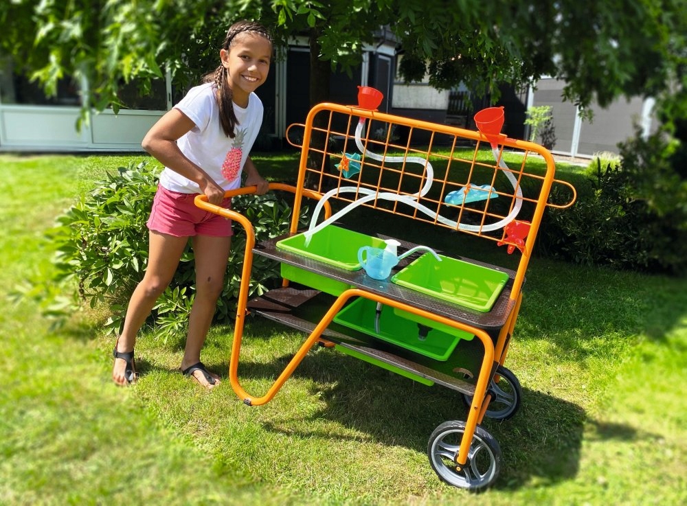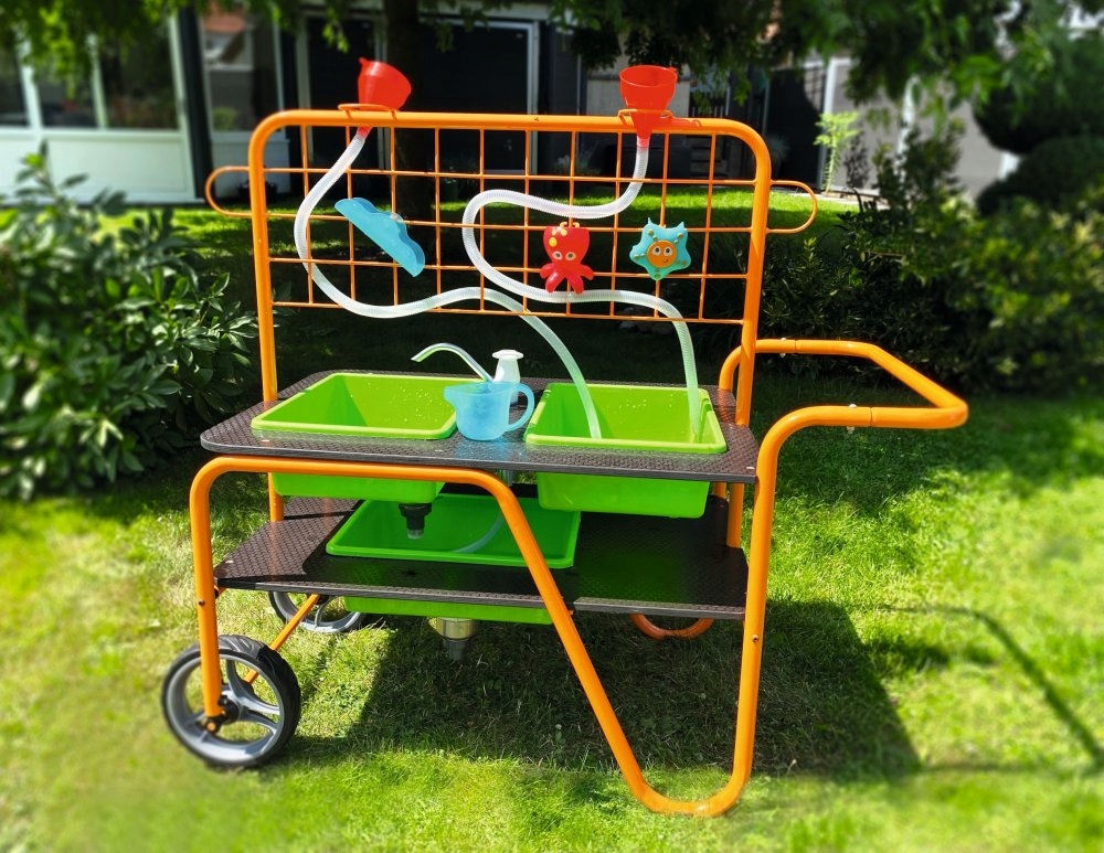 Мобільна водна таблиця пропонує багато можливостей, що експериментальні мають дві ємності з водою із закритими торговими точками та нижньою ємністю, з якої діти можуть накачати воду. Ручні розваги тренують ефективність дітей та координацію очей.