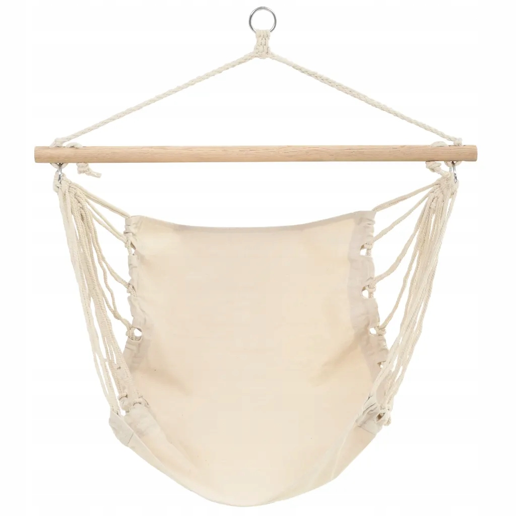Кремовий гамак був виготовлений у формі зручного крісла. Це чудово працює як зручний садовий предмет меблів. Матеріал - це бавовна з домішкою поліестеру та дерев’яною підвісною променем. Завдяки металевим кільцям ви можете легко повісити своє зручне крісло на носок, стояти або навіть на дерево. Одна людина буде зручно сидіти в ньому, а його максимальне навантаження - 110 кг.
