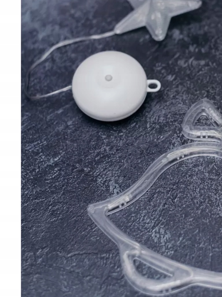 Велика присоска, покрита білим кілком, з місцем для батарейок і кабелем, що виходить з них, на якому висить зимова прикраса.