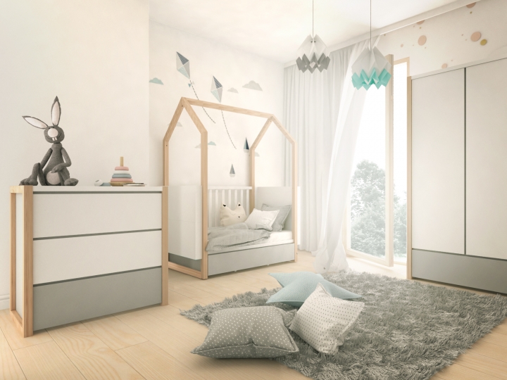 Відмітний елемент дизайну – легка, тепла сосна, ідеальна у своїй недосконалості. Ці недоліки включають випадкові вузлики, делікатні тріщини та неоднорідні кольори. У поєднанні зі звичайною поверхнею інших елементів вони створюють унікальний ефект.