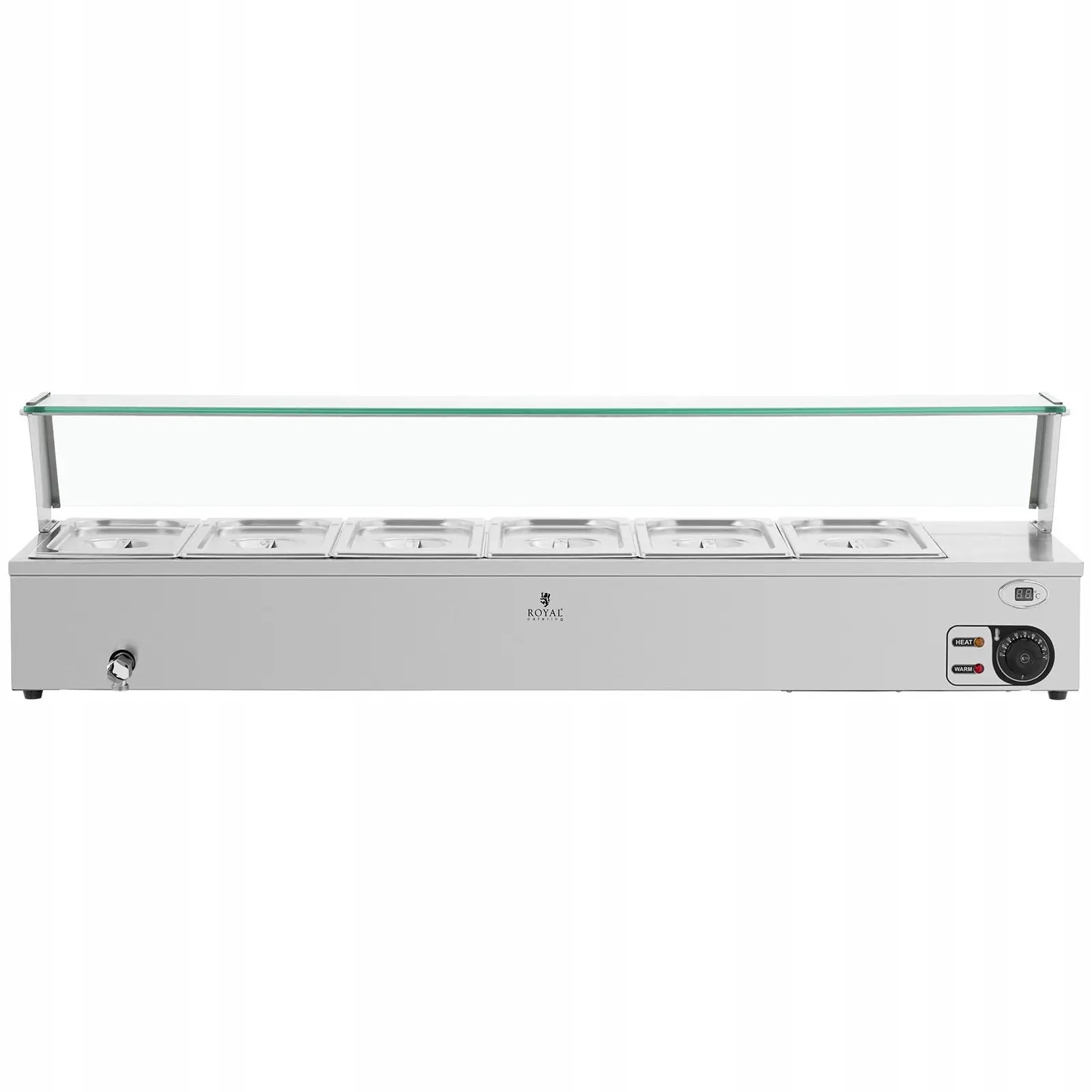 4 Він працює для використання в ресторанах, готелях, їдальнях, буфінах, барі з закусками, кафе або тихих старих і клінік. 6 Gn контейнери Дозвольте зберігати інгредієнти або кілька різних страв, таких як м'ясо, риба, овочі, рис, картопля та соус при потрібній температурі - без ризику спалювання. Великий живлення 2100 Вт швидко нагріває водяну баню до потрібної температури. Температура регулюється з ручкою в діапазоні 30-110 ° C . BEMAR оснащений тригерним півнем, який полегшує використання. 6 Gn 1/3 контейнери з кришками пропонує загальний об'єм 21 л . Контейнери повністю видаляються, їх можна наповнити їжею безпосередньо в зоні приготування їжі та розміщувати в Бемарі. Пристрій має скляну кришку з безпечного скла. Він встановлений на кілька простих кроків. Обкладинка захищає їжу та судини від бруду. У той же час пропоновані страви чітко видно для клієнтів. BEMAR виготовлений з нержавіючої сталі, яка характеризується довговічністю та корозійною стійкістю та ударами. Нейтральний для здоров'я і простий у чистці, а отже, гігієнічні.