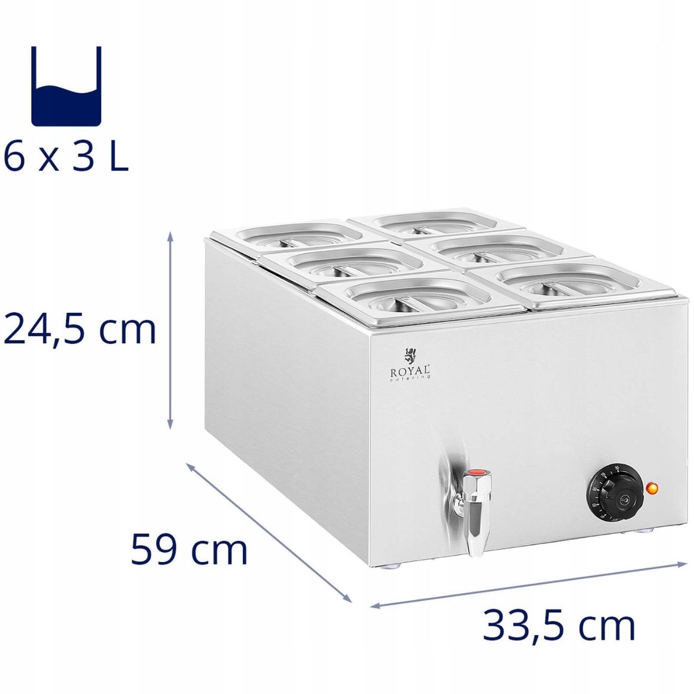 Чи звучить апетитно свіжа їжа, яка довго зберігалася теплою? Це можливо з мармітом від Royal Catering! У 6 контейнерах GN ви можете розмістити напр. м'ясо, риба, картопля, рис або соус. Вони будуть підтримувати потрібну температуру, не пригораючи. Опалювальний марміт оптимально задовольнить потреби навіть висококласних закладів громадського харчування.