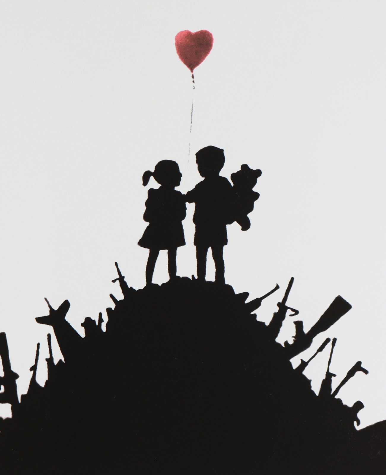 Графіка, на якій зображено пагорб, усіяний зброєю, на якому стоять хлопчик із плюшевим ведмедиком і дівчина з повітряною кулею.