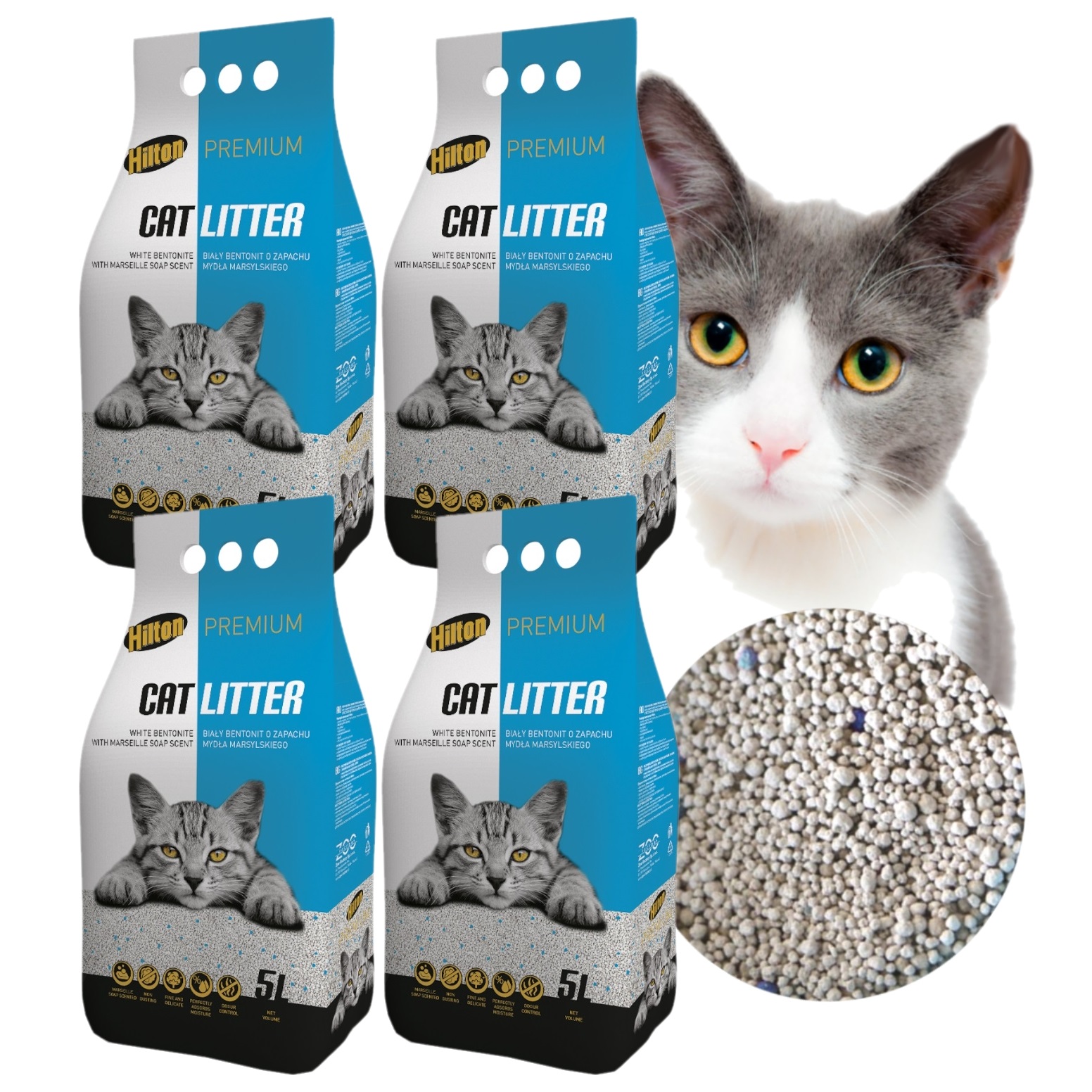 Hilton Premium, білий бентонітовий наповнювач з ароматом марсельського мила для кішок, 20 літрів (4 упаковки по 5 літрів)