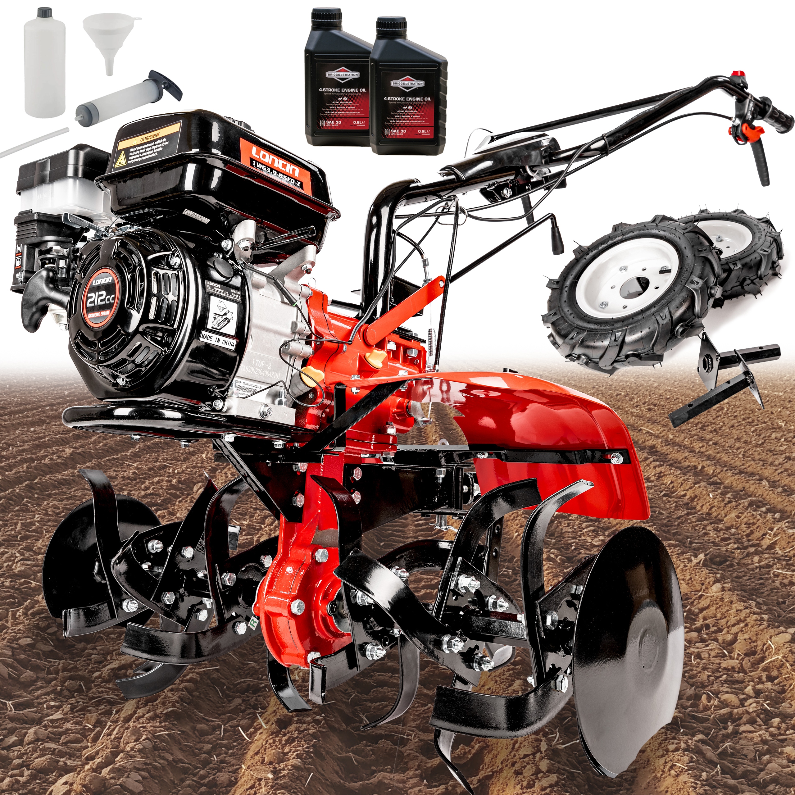 Пристрій оснащено надійним двигуном Loncin LC170F-2, який дуже популярний серед користувачів, які шукають надійні та ефективні приводи. Він пропонує потужність 4,4 кВт при 3600 обертах за хвилину та об'єм 212 см³, що дозволяє легко справлятися із складними завданнями, такими як розпушування важкого ґрунту, видалення бур'янів або підготовка землі для нових посадок. Це пристрій стійкий до інтенсивного використання, а завдяки міцній конструкції його можна використовувати протягом багатьох років. Двигун оснащений ефективною системою повітряного охолодження, що дозволяє підтримувати оптимальну робочу температуру, запобігаючи перегріву двигуна при тривалій експлуатації.