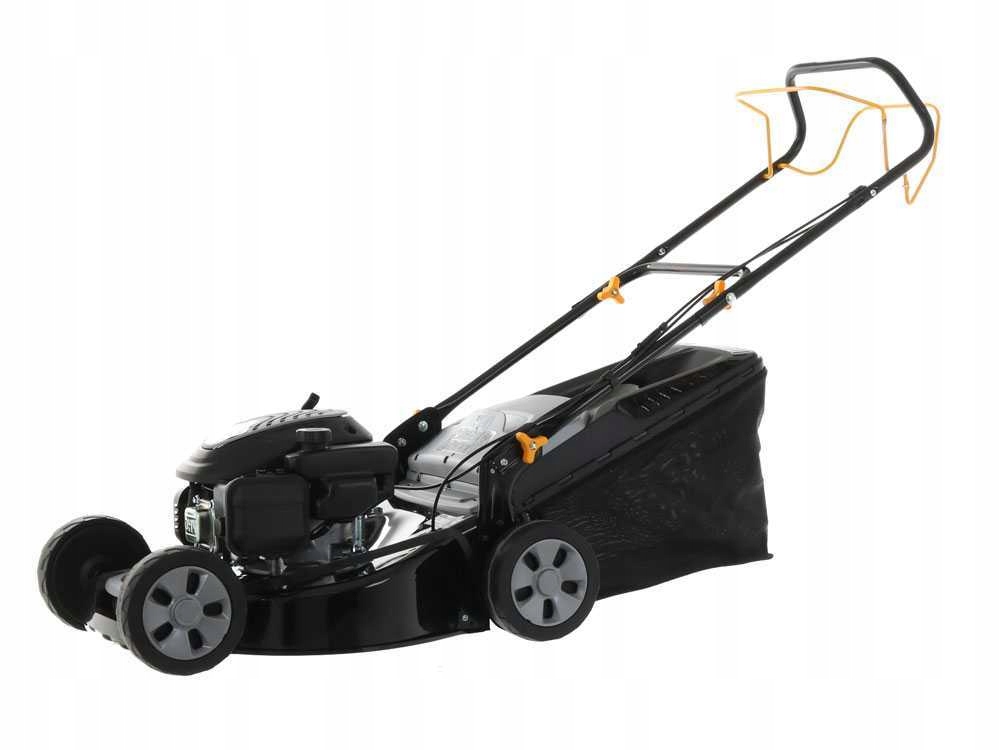 Кермо косарки регулюється по висоті та має ергономічну ручку, що забезпечує комфорт під час керування. Колеса на шарикопідшипниках гарантують плавність їзди протягом тривалого часу. час.