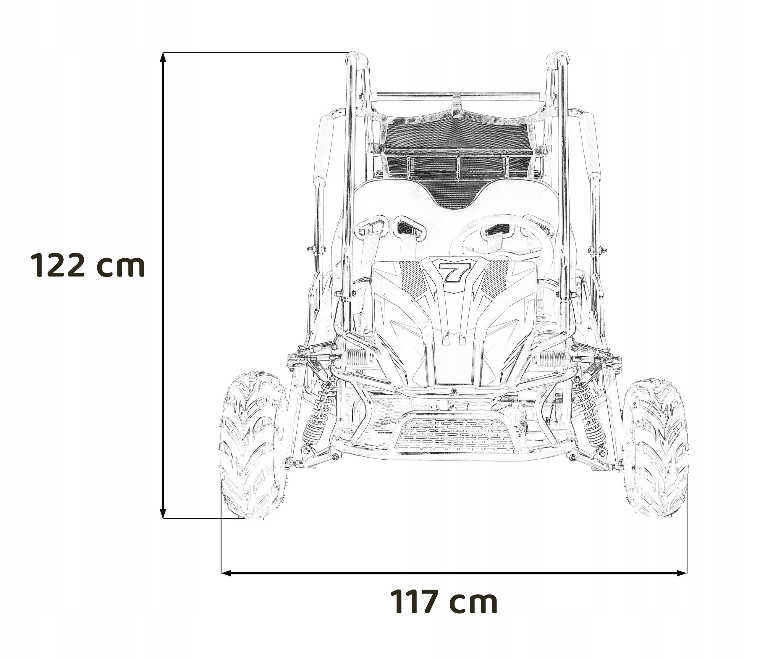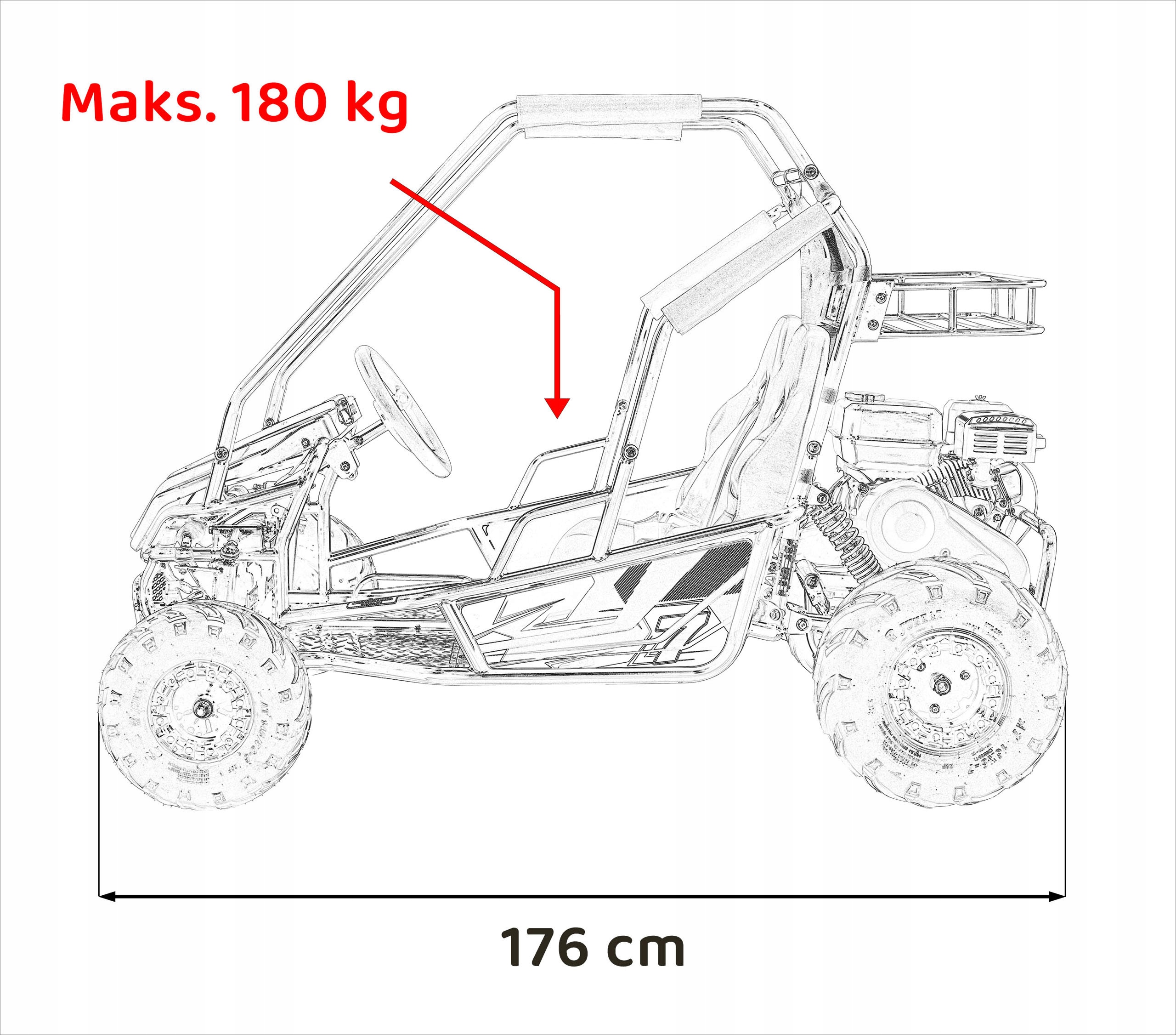 Технічні характеристики BUGGY Двигун внутрішнього згоряння LUCKY SEVEN Специфікація міцна, міцна рама з порошковим покриттям, посилена задня поворотна рукоятка, високоякісна гнучка пластмаса, губчастий повітряний фільтр, табличка з номером двигуна та виробничою серією паливного клапана, додатково посилений каркас безпеки для заднього багажника пасажира та водія - 58x30x8 см Siniki 212 см3, одноциліндровий чотиритактний з повітряним охолодженням Система запуску вручну + кнопка Шини Шини з насосом і товстим протектором спереду: 145/70-6 ззаду: 16*8-7 Гальмівна система ззаду: гідравлічні дискові гальма Підвіска спереду - 2 x амортизатори ззаду - 2 x регульовані амортизатори Привідний ланцюг Спортивне сидіння + водонепроникні ремені безпеки 3-ступеневе регулювання сидіння Розміри - 80x31x50 см Швидкість до 38 км/год Розміри Розмір транспортного засобу Довжина 176 см, ширина 117 см, висота 122 см, вага автомобіля 116 кг, розмір коробки 170x117x122 см, вага коробки 146 кг, максимальне навантаження 180 кг Дорожній просвіт 22 см, інструкція з додаткового обладнання + монтажний комплект,