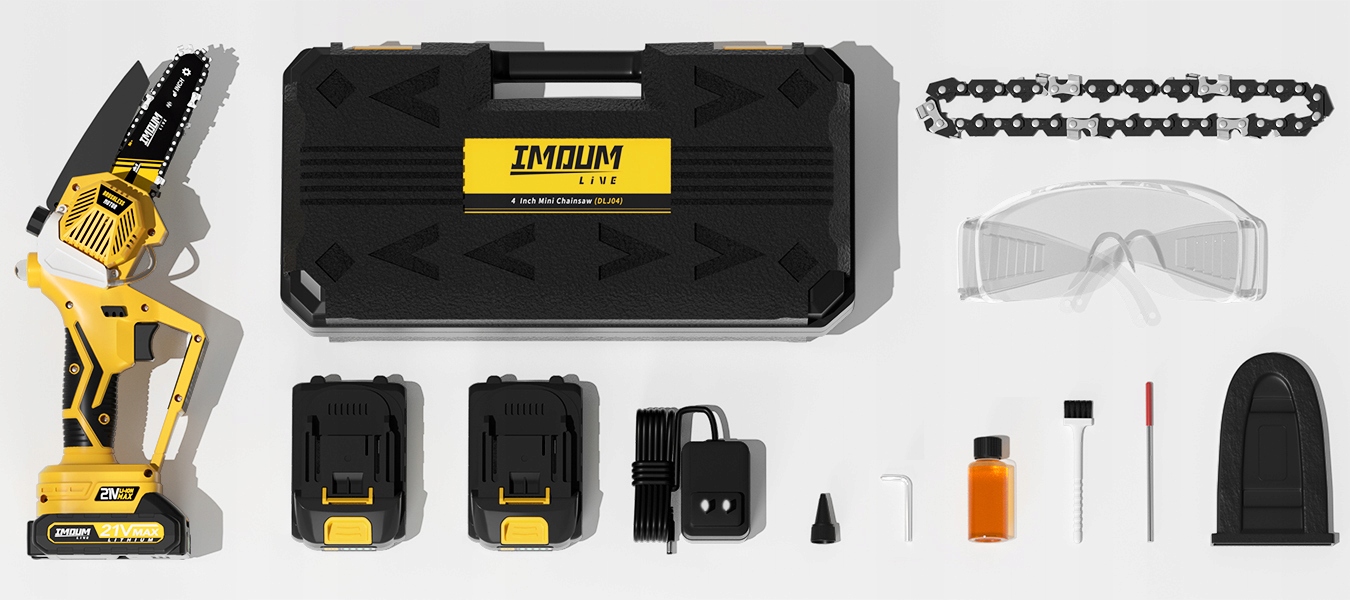 Окрім пилки, є два акумулятори, зарядний пристрій, викрутка, ланцюг 2х, ланцюг -направляючі, затоки ланцюга, чистка щітка, воронка для виливки масла, ключ від розетки, захисні окуляри, посібник користувача в польській мові.