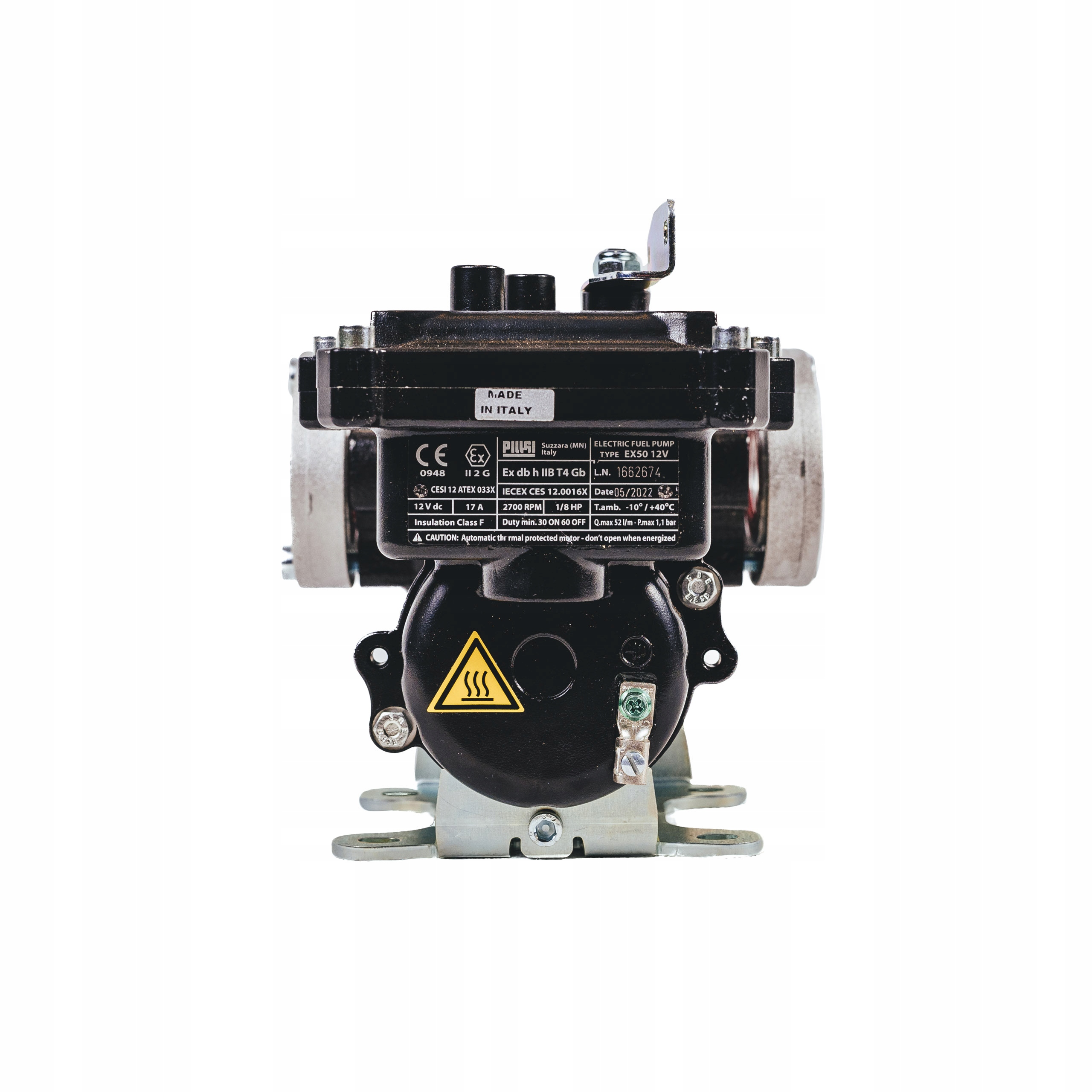 Насос EX 50 л/хв від італійської компанії PIUSI призначений для займистих палив та інших рідин з подібними властивостями. Насос EX 50 живиться від змінної напруги 230 В, досягає максимальної ефективності 50 л/хв і адаптований для роботи в першому та друга зона вибухонебезпеки. Чавунний корпус робить пристрій дуже міцним. Займистий паливний насос призначений для роботи в циклах (30 хвилин роботи, 60 хвилин перерва). У пристрої використовуються з'єднання 2 x GW 1” BSP і перепускний клапан, що дозволяє насосу працювати з закритим напором не довше 2-3 хвилин. Насос може працювати при температурах від -10 градусів С до +40 градусів С
