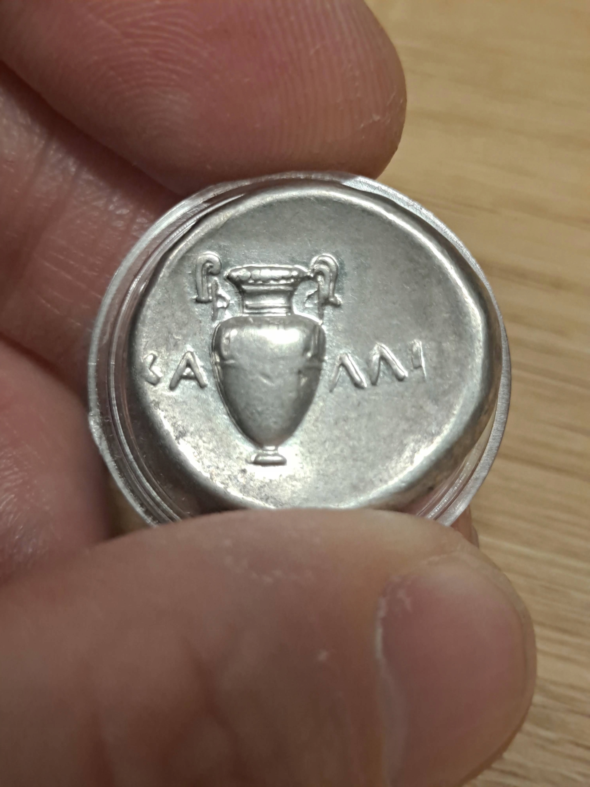 Реверс: KA-ΛΛI; амфора, все всередині круглої інкузуми.