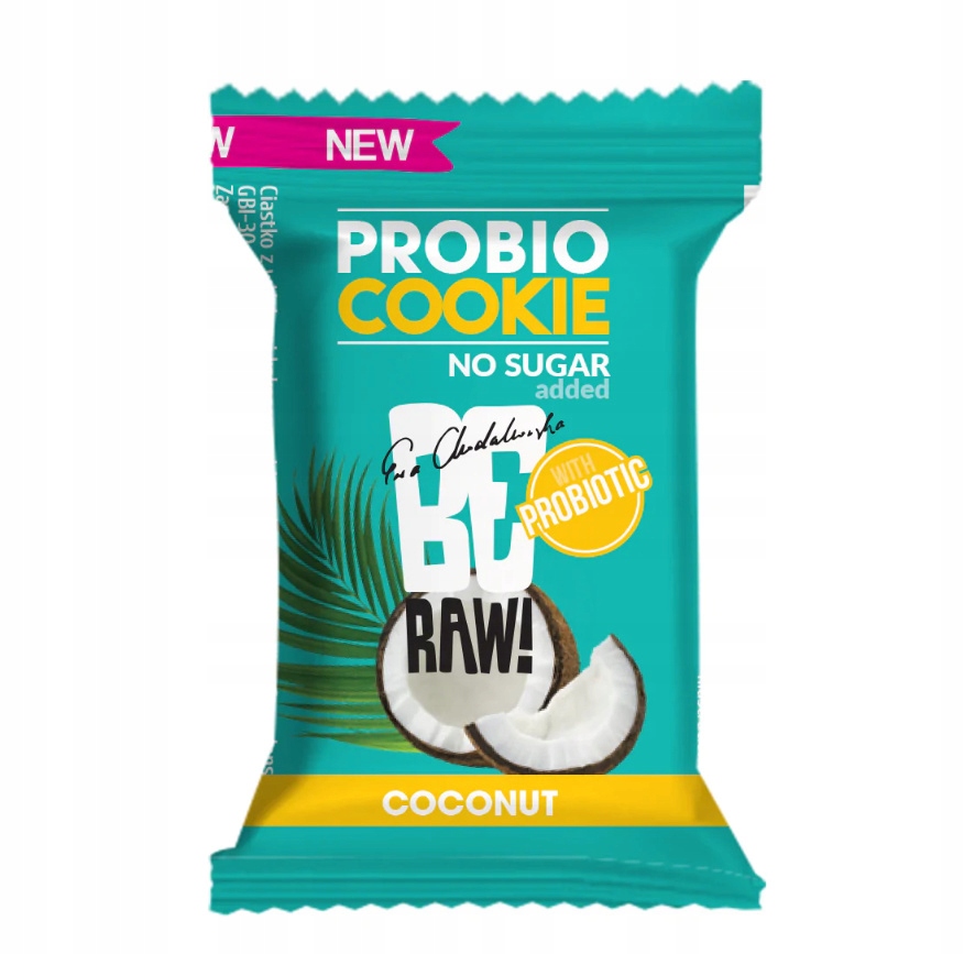 BeRAW Probio Cookie із солодким інтенсивним смаком білосніжної кокосової стружки готується на основа натуральних компонентів. Це смачна закуска, ідеальна «на один раз», без додавання цукру, містить природні цукри, без пальмової олії та штучних інгредієнтів.