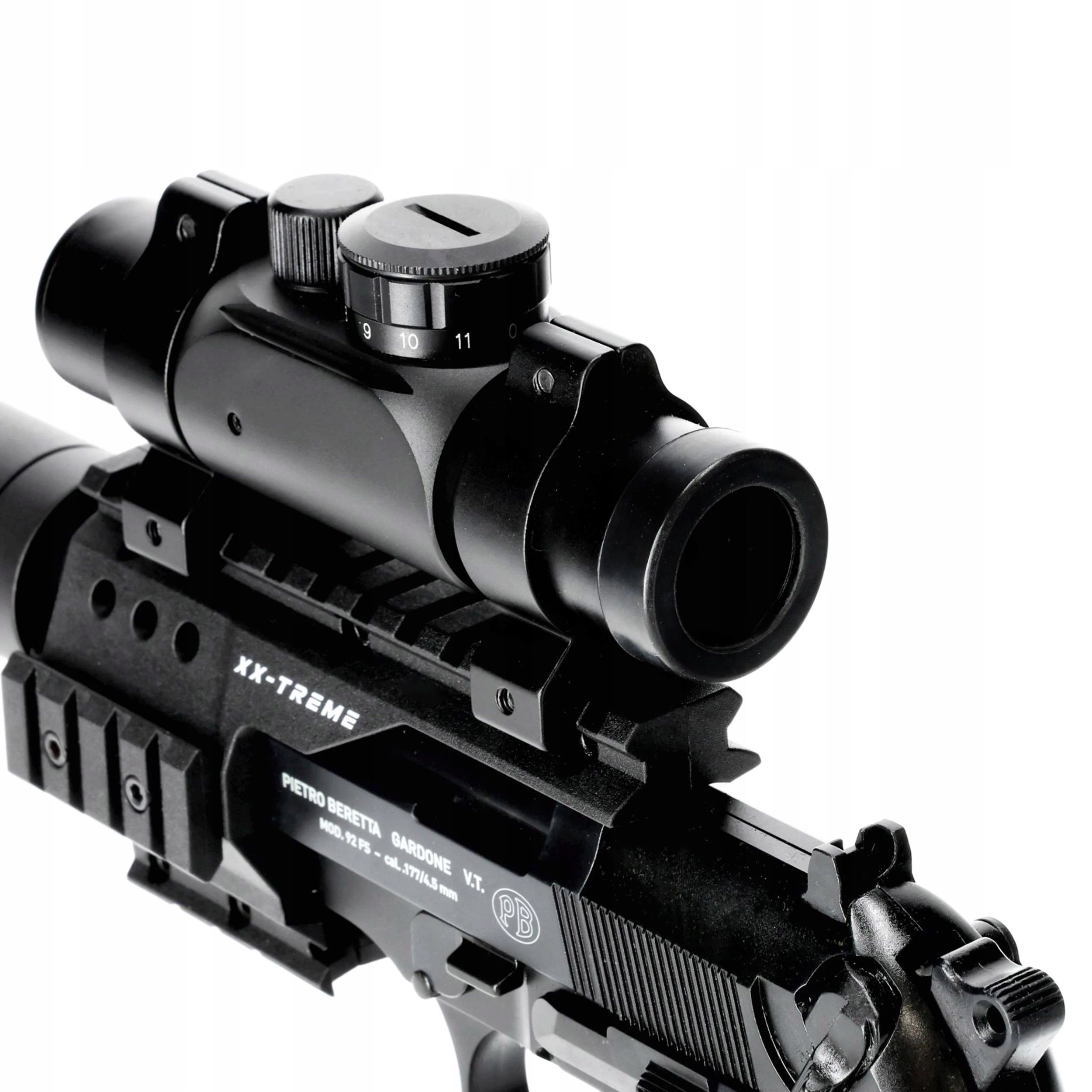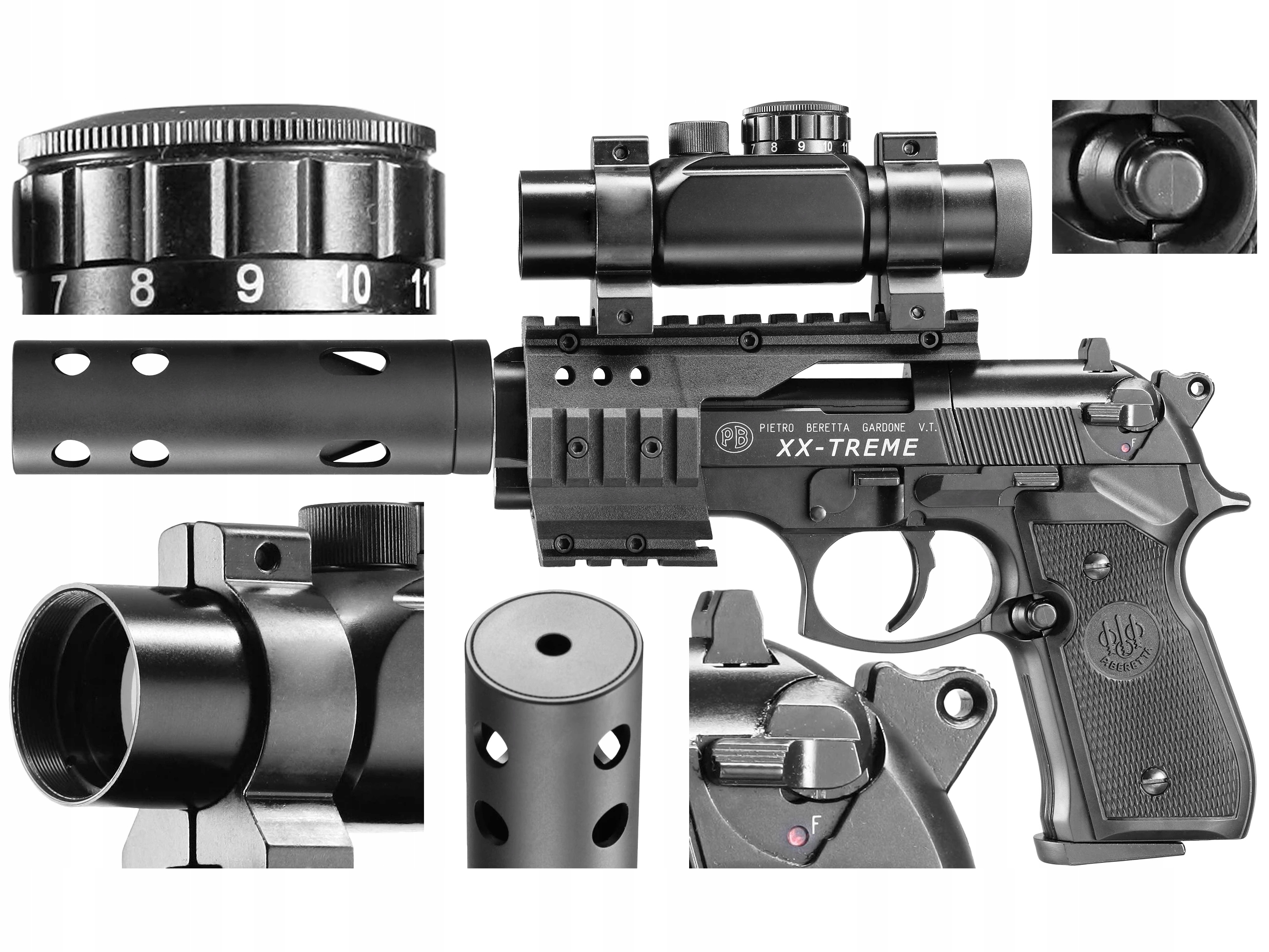 Beretta M92 FS XX-TREME 4,5 мм -це широкий набір стрільби, в якому, крім Windbreaker Brett M92 FS, є також верхній точковий коліматор, модератор вихлопних газів і складання з 4 рейками Picatinny. Ручка була зроблена повністю з металу , завдяки якому ми отримуємо міцний, добре, що є пневматичним пістолетом. Праворуч і ліворуч -стрільці. Ці прості рішення дуже корисні, коли ми знімаємо на слабкому або залишковому світлі. Реалізм структури додатково піднімається за допомогою позначки ліцензованого виробника та логотипами, інтегрованими в зчеплення. Точність у 8 штук завантажується для знімного барабанного журналу, встановленого у верхній частині блоку. Збірка та заміна капсули дуже прості і вимагає лише розміщення картриджа в зчеплення та затягування гвинта. SA/DA