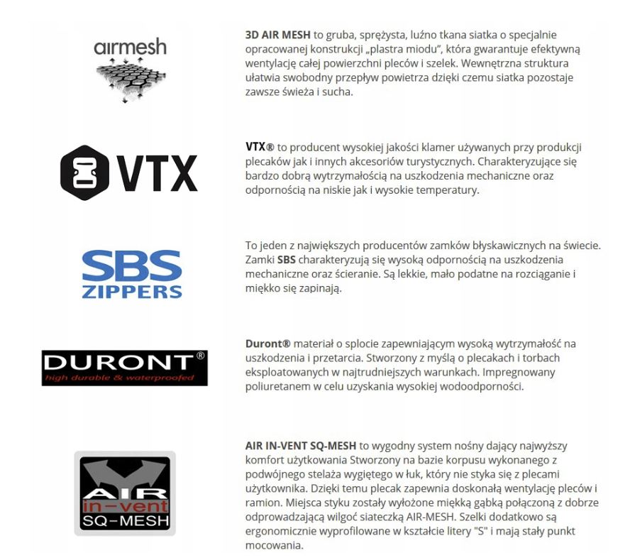 Виготовлений із сучасного матеріалу сот-rip-stop duront® , який поєднує низьку вагу з високою стійкістю до механічних пошкоджень. повітряна сітка , розміщена на брекетах і спині, дозволяє постійному циркуляції повітря, зменшити пітливість та покращити комфорт використання.