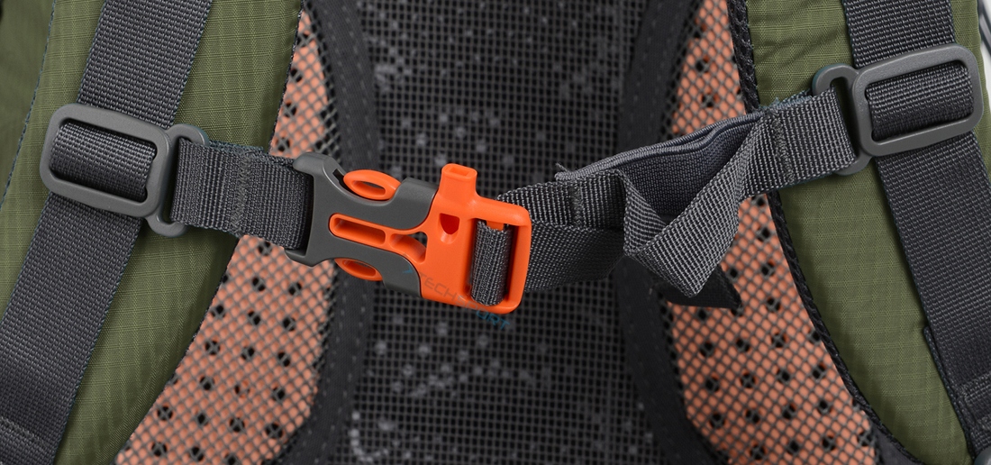 Скримовий пояс має гнучкий розділ, що дозволяє безкоштовно дихати та вертикальну систему регулювання. У пряжку було вбудовано рятувальний свист: