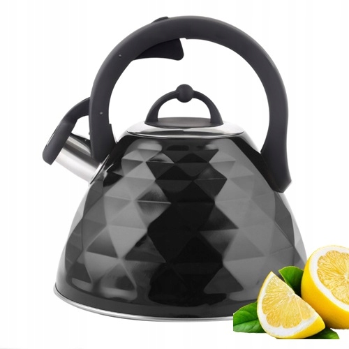 Чайник сучасної форми, покритий чорною емаллю. 5-шарове дно забезпечує швидку теплопередачу, що впливає на екологічне використання енергії. Чудова м’яка ручка з інтегрованим механізмом опускання та піднімання зі свистком.