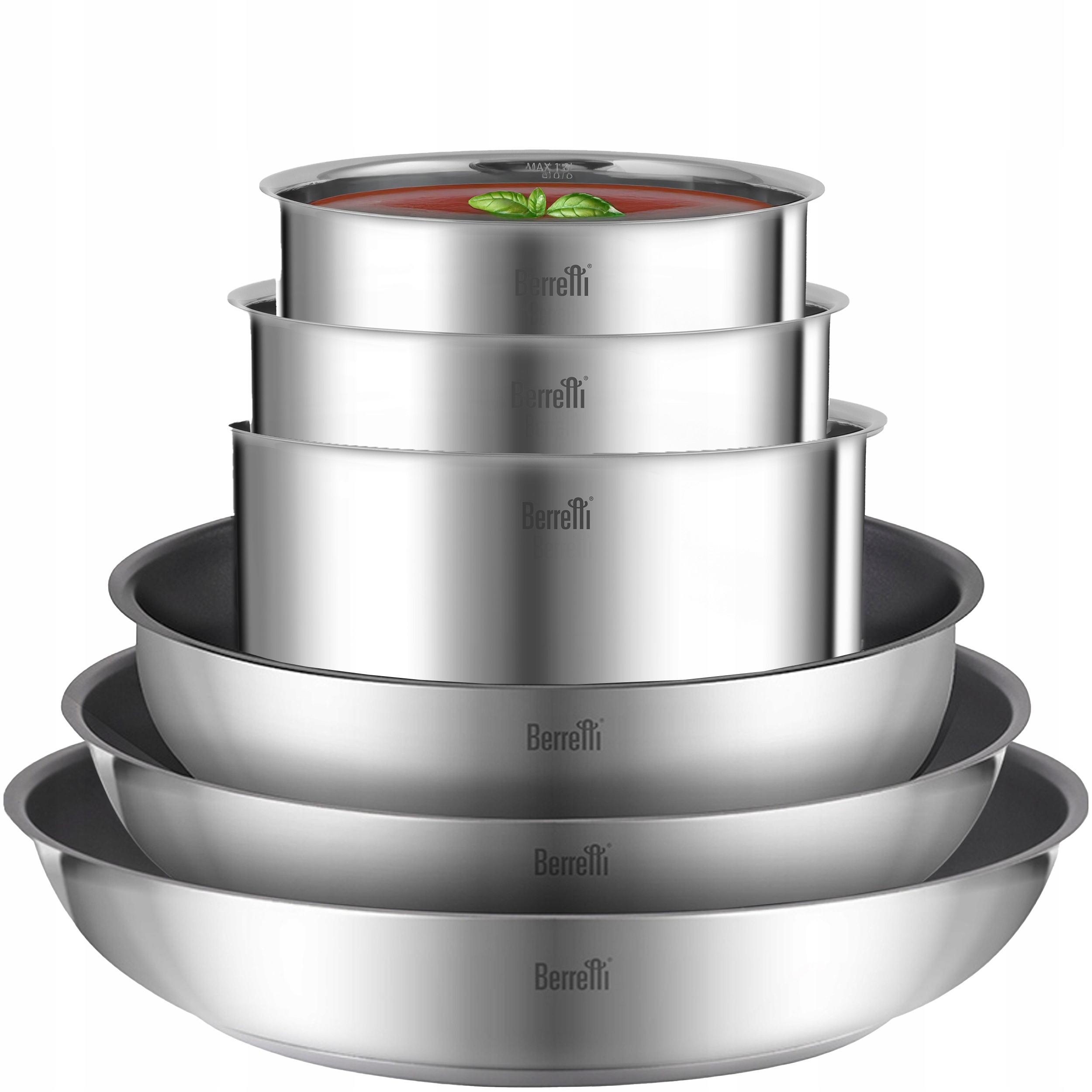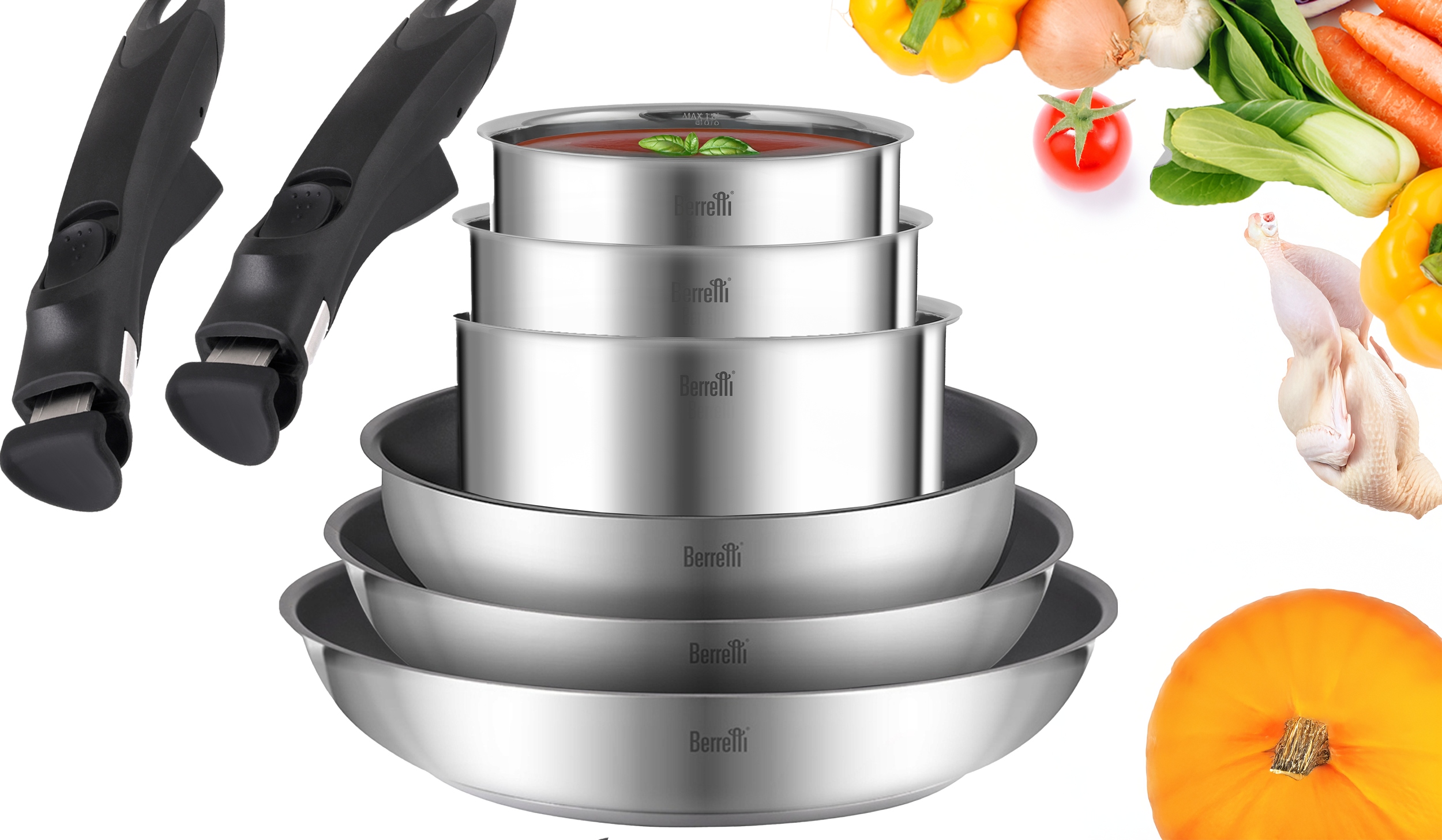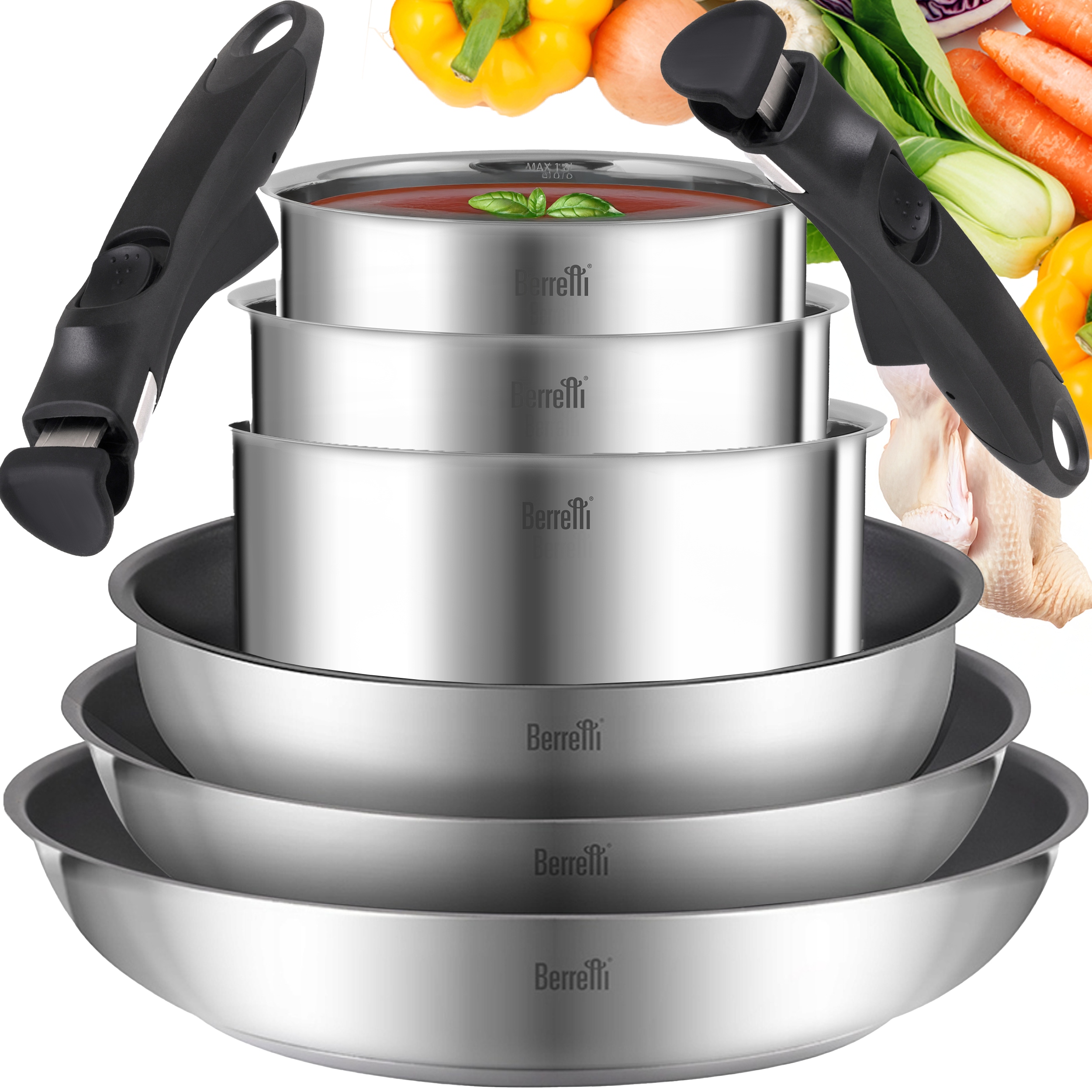 BERRETTI ZESTAW GARNKÓW + PATELNIE STALOWE Z ODPINANĄ RĄCZKĄ COMODO 8el