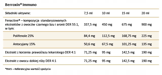 Berroxin® Immuno - інгредієнти: сироп агави (75%), очищена вода, Fenactive® - [екстракт чорного фрукта бузини чорної (Sambucus nigra) і плодів чорноплідної горобини (Aronia melanocarpa) стандартизованих до 25% поліфенолів і 15% антоціанів], екстракт кореня алтея лікарського (Althaea officinalis), екстракт шипшини (Rosa canina), концентрат лимонного соку.