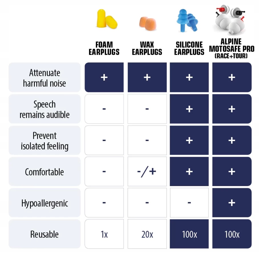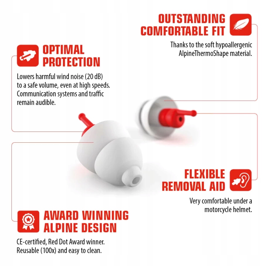 Alpine MotoSafe Pro складається з двох повних комплектів берушів для мотоциклів: одного набору MotoSafe Tour і одного набору MotoSafe Race. MotoSafe Race: ідеальні затички для вух для шосе, треку або їзди з відкритим обличчям. MotoSafe Tour: ідеальні беруші для кінних прогулянок, відпустки та дороги. Беруші MotoSafe зменшують шкідливий шум, не змушуючи вас почуватися відключеним від оточення. Завдяки інноваційним фільтрам AlpineAcousticFilters™ навколишній трафік, навігаційна система, домофон і мотоцикл залишаються ідеально чіткими. Цей комбінований пакет містить два комплекти берушів і пляшку Alpine Clean (5 мл)