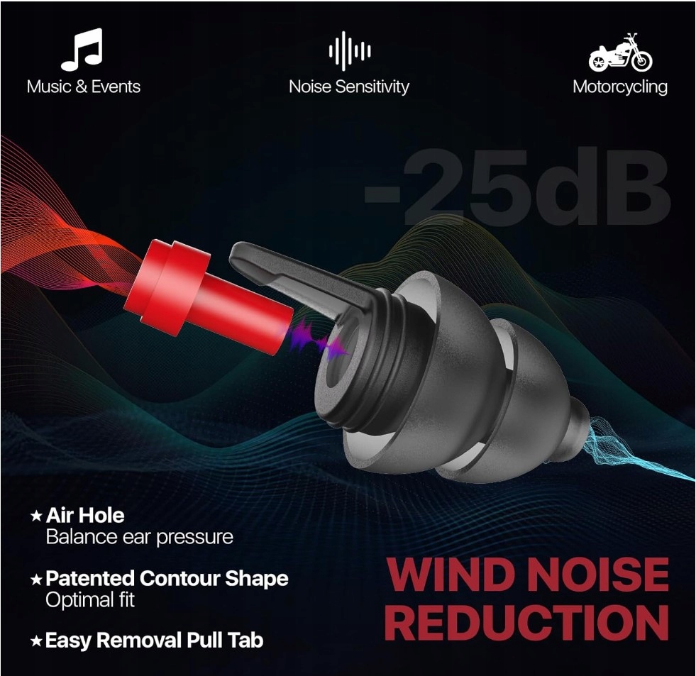 Високий рівень шуму може викликати дискомфорт, відволікати увагу та втомлювати мотоцикліста. Затички для мотоциклів забезпечують зниження рівня шуму до 25 дБ, надійно захищаючи ваші вуха під час їзди. Вони захищають ваші вуха від оглушливого реву вітру та шуму двигуна, захищаючи ваш дорогоцінний слух протягом багатьох років задоволення від їзди. Затички для вух, що запобігають вітру, є ідеальним захистом слуху під час гонок на треку.
