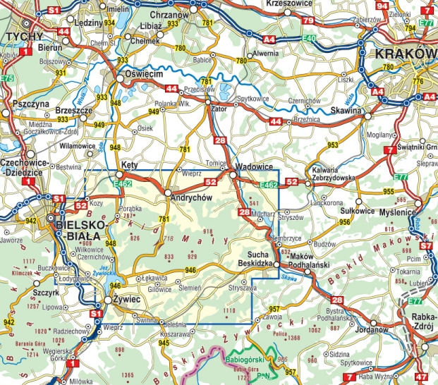 Оновлене видання карти, що показує райони найчастіших подорожей Папи Івана Павла ІІ. Останніми роками Малий Бескид особливо охоче відвідують польські та іноземні туристи. Територія, показана на карті, знаходиться між Бельсько-Бялою на заході та Сухою Бескідзкою на сході, Вадовіце на півночі та Живцем на півдні. На зворотному боці карти міститься велика кількість інформації про представлену територію, туристичний путівник, барвисті фотографії, опис туристичних притулків, підйомників та закладів розміщення з туристичною інформацією.