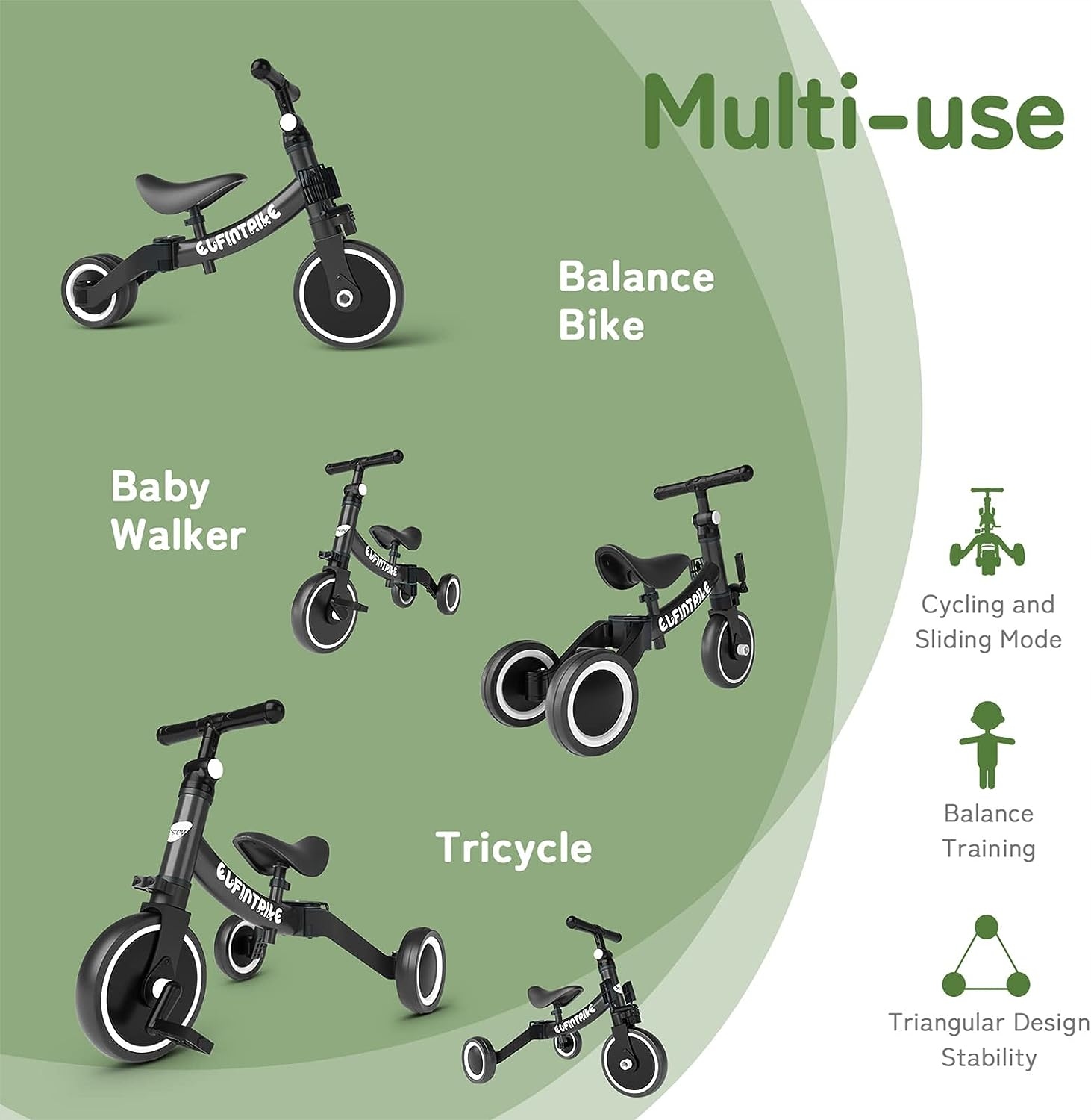- 5 з 1 -го велосипедного велосипеда призначений для хлопчиків та дівчат від 1 до 4 років. Дитячий велосипед можна використовувати в трьох режимах: три -колесний режим (великий / малий кут), короткий режим та режим ходьби (великий / малий кут).