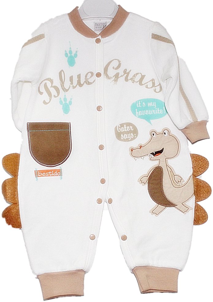Рампи з довгими рукавами та ногами. Зроблено з велюру. Весь гнучкі білі з пришитним крокодилом та написами. Гладка біла спина.