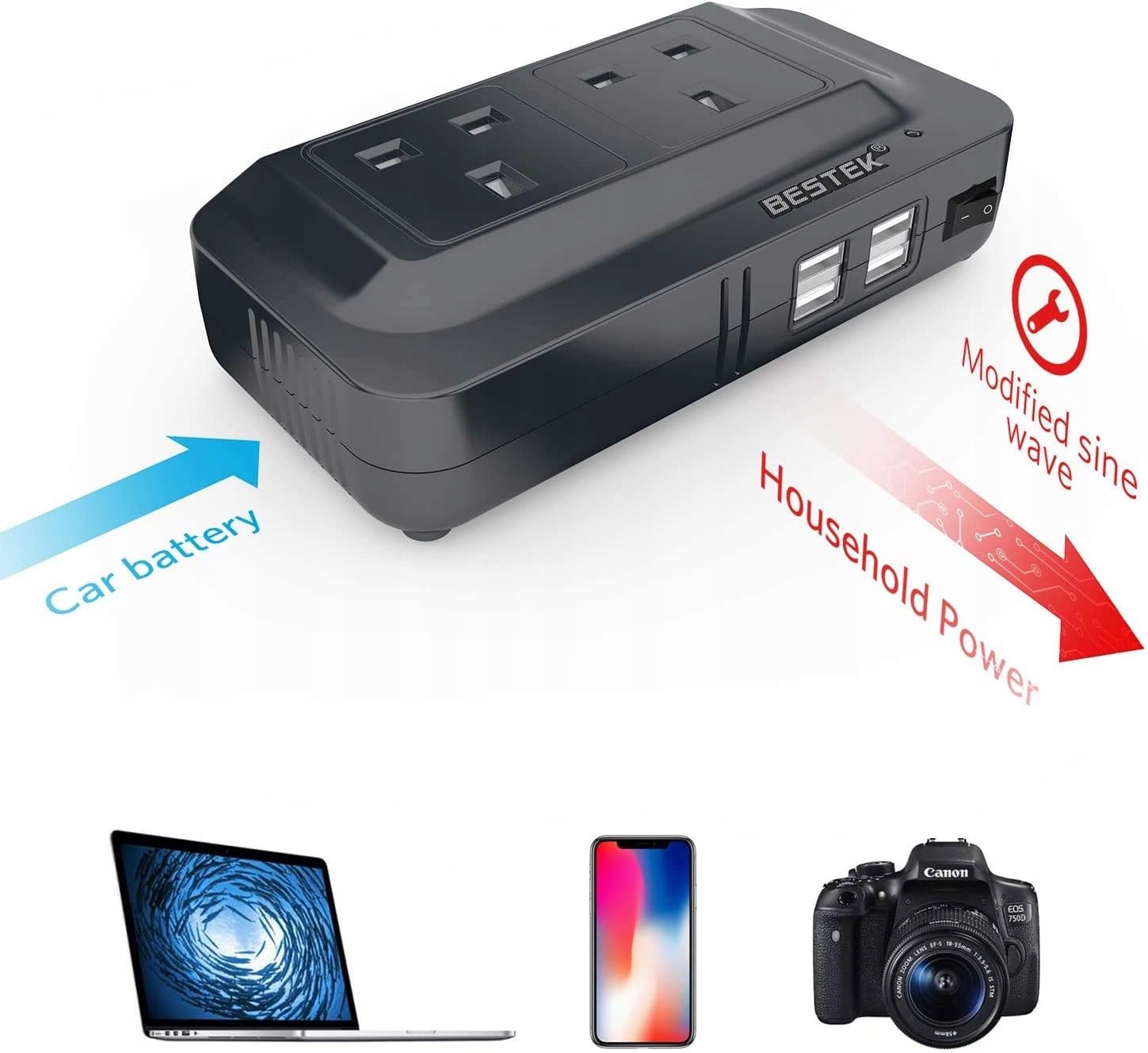 Перевага бестів: провідна марка інвертерів влади у Великобританії. Він забезпечує 200 Вт безперервного постійного струму для змінного струму та 220 Вт пікової вихідної потужності для зарядки багатьох електронних пристроїв на подорожі. Зарядні пристрої, обладнання для кемпінгу та мобільне офісне обладнання. Ультракомпактний дизайн, ідеально підходить для використання інвертора на подорожі, в кемпінгу або в будь -якому місці, де потрібен живлення. Цей інвертор має низьку сигналізацію заряду акумулятора, відключаючи низький заряд акумулятора, захист від перевантаження, захист від короткої сили
