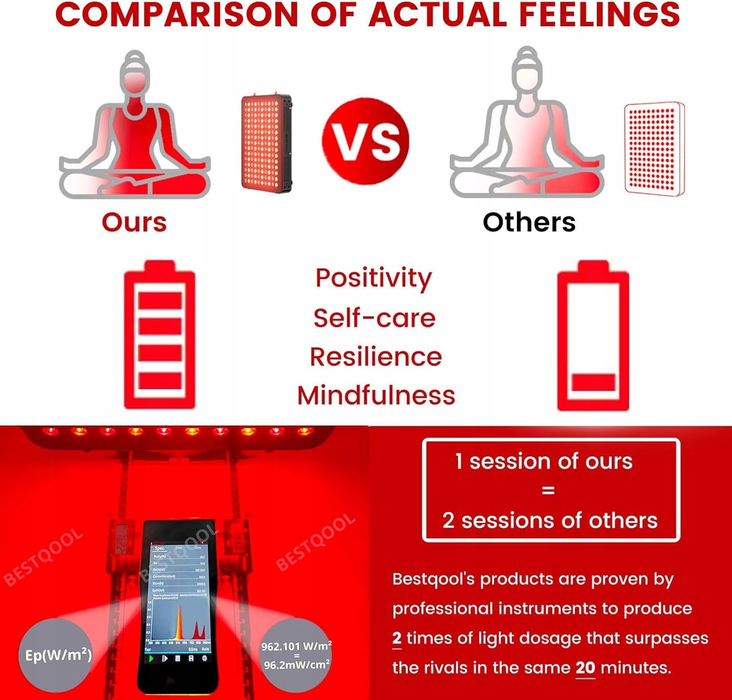 Модульна конструкція для багатьох пристроїв: відповідають унікальній отвори для з'єднання з пластинами BestQool бренду, щоб легко з'єднати два або більше пристроїв терапії червоним світлом вдома. Це створює більш широку випромінювальну зону, що нагадує сонячне світло і збільшує поглинання червоного світла під час терапевтичних сеансів. Вивільнення тепла У випадку контакту зі шкірою інтелектуальна система управління забезпечує більшу гнучкість та персоналізацію для створення власної терапії. 96,2 мВт /см² На відстані 3 дюймів споживання енергії є найважливішим елементом, що визначає успіх терапії. Чим більше споживання енергії, тим краще ефект. Оснащений 150 світлодіодами з кутом освітлення 60 та модульною конструкцією, максимально збільшує діапазон і підвищує ефективність терапії. Багато людей думають, що вони забезпечують користь для здоров'я шкіри та очей, заспокоюють біль, забезпечують кращий сон, покращують енергію та не тільки. Вимоги, залежно від типу тіла або шкіри, терапія червоним світлом - найкраща всебічна терапія тіла для всіх вдома. Даючи своїм близьким панель з червоним світлом
