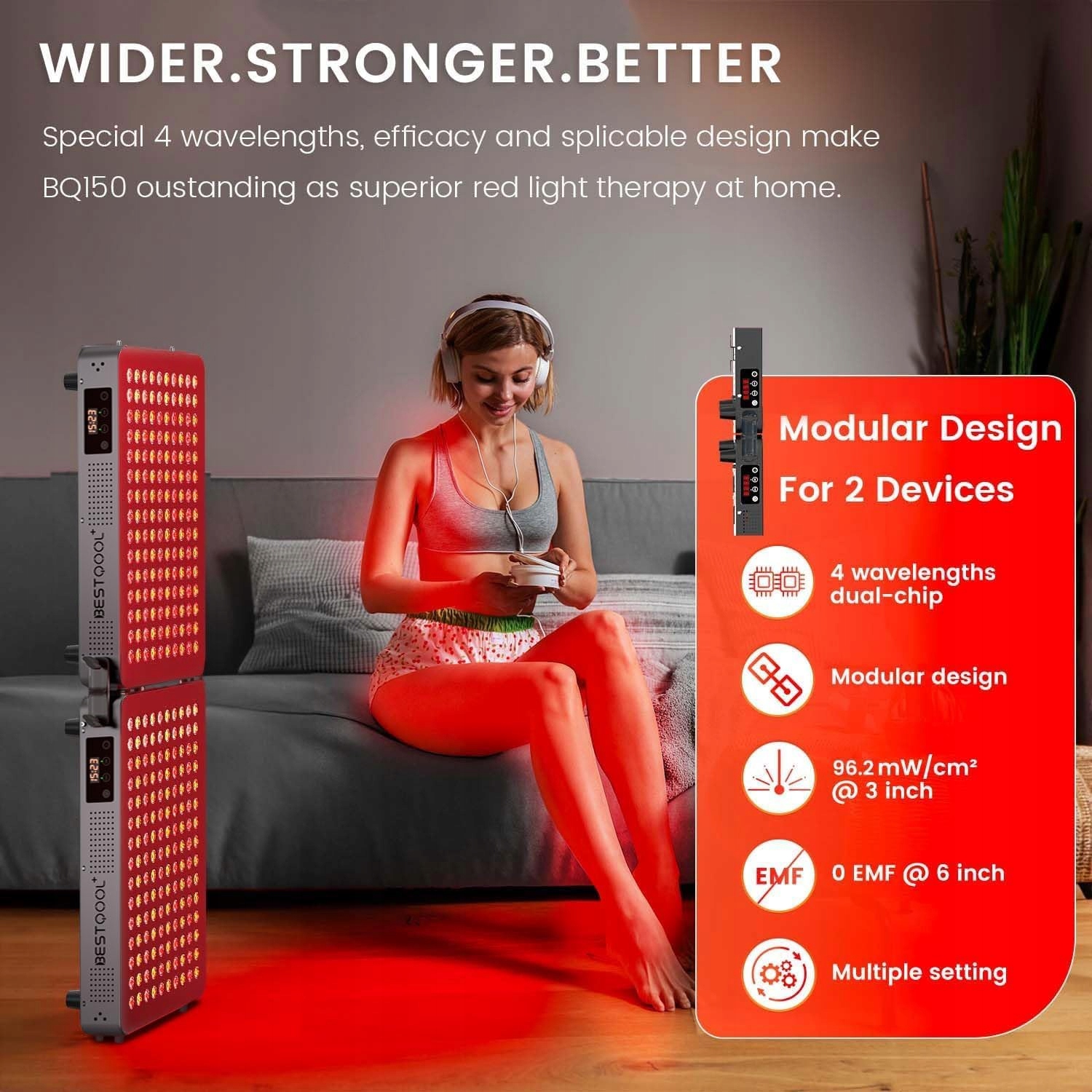 Відновіть своє здорове та сильне «я»: заощаджуйте багато часу та грошей, щоб відновити здоровий розум і тіло вдома, використовуючи унікальний модульний дизайн з двома мікросхемами BQ150. 10 хвилин впливу нашої терапії червоним світлом відповідає 20 хвилин впливу іншими пристроями. Це простий спосіб збільшити виробництво колагену та покращити регенерацію після домашнього навчання. Світло так само необхідно для клітин, як їжа для людей. Сильніший. Краще: більш широка область опромінення не лише дає кращі терапевтичні результати, але й збільшує більшу дозу. Однією з головних переваг BQ150 як модульного червоного світла в домашніх умовах є розблокування більшої кількості матчів на власній панелі терапії червоного світла. 150 подвійних світлодіодів Використовуйте довжину червоного світла хвиль (630 660) та закрито інфрачервоний (850 940), що дозволяє поглинати більше світла.